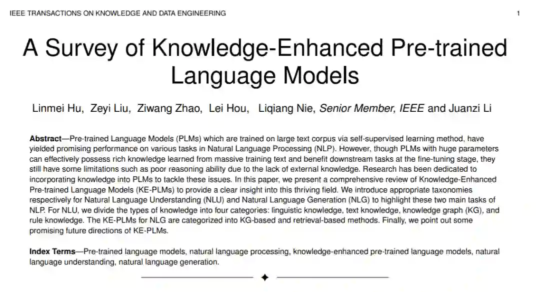 预训练模型主要从海量未标注、无结构化的数据中学习,但缺少外部知识指导,存在模型学习效率不高、模型效果不佳和知识推理能力 受限等不足。如何在预训练模型中引入语言知识、世界知识等外部知识,提升模型效果以及知识记忆和推理能力是一个难题。本文对知识增强预训练语言模型(KE-PLMs)进行了全面的综述。