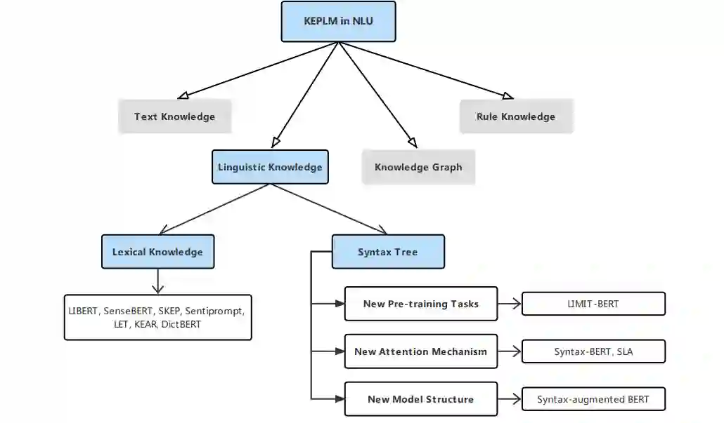 NLU是NLP的一个组成部分,涉及使机器能够理解和解释文本数据内容的所有方法。它从非结构化文本中提取核心语义信息,并将这些信息应用于下游任务,因此在文本分类、关系提取、命名实体识别(NER)和对话系统等应用程序中发挥着重要作用。根据图1所示的分类法,我们将为NLU任务设计的KE-PLM所包含的知识按照不同的类型分为以下四类: 语言知识、文本知识、知识图谱和规则知识。对于每一类,我们讨论了其代表性的方法。