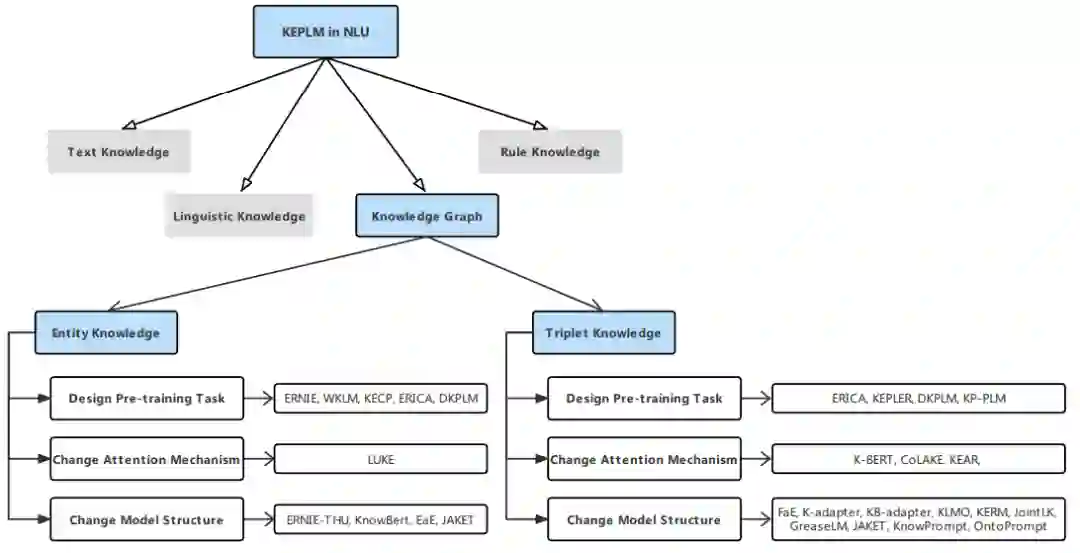 为了解决上述问题,将知识明确地融入PLMs已经成为最近NLP研究的一个新兴趋势。Wei等人[12]从三个方面回顾了知识增强的PLM:知识来源类型、知识粒度和应用。Yin等人总结了基于预训练语言模型的知识增强模型(PLMKEs)的最新进展,根据PLMKEs的三个关键元素: 知识来源、知识密集型NLP任务和知识融合方法。在本研究中,考虑到在语言模型中注入知识可以促进NLU和NLG任务的完成,而这两个领域的重点不同,我们旨在对这两个领域的知识增强预训练语言模型(知识增强预训练语言模型,KEPLMs)进行综合综述,以提供知识增强预训练语言模型在NLU和NLG中的各自见解。