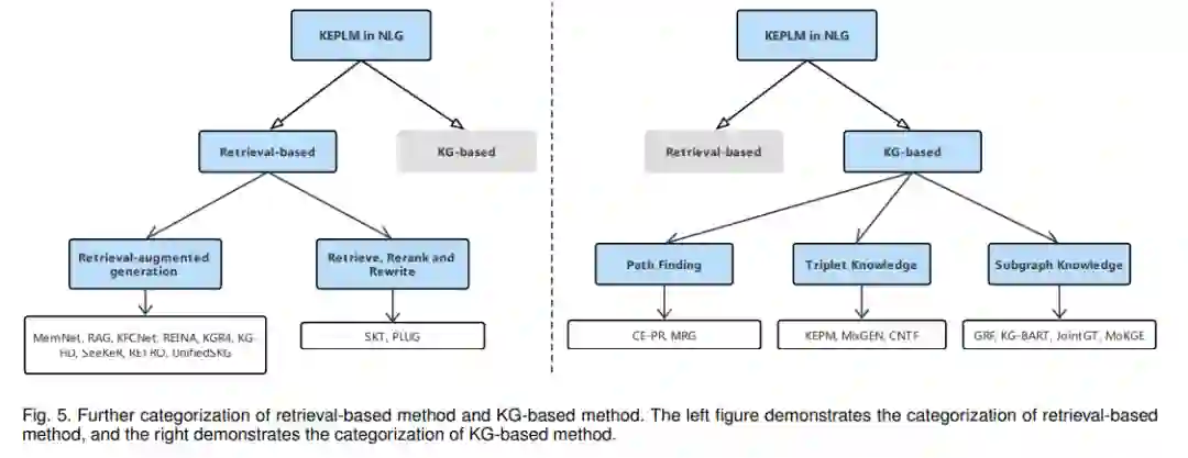 (2) 对于NLU,根据知识类型将KE-PLMs进一步划分为语言知识、文本知识、知识图(KG)和规则知识四个子类别。对于NLG,基于知识来源,将KE-PLMs 进一步分为基于检索的方法和基于KG的方法。图1显示了我们为NLU和NLG提出的分类法。