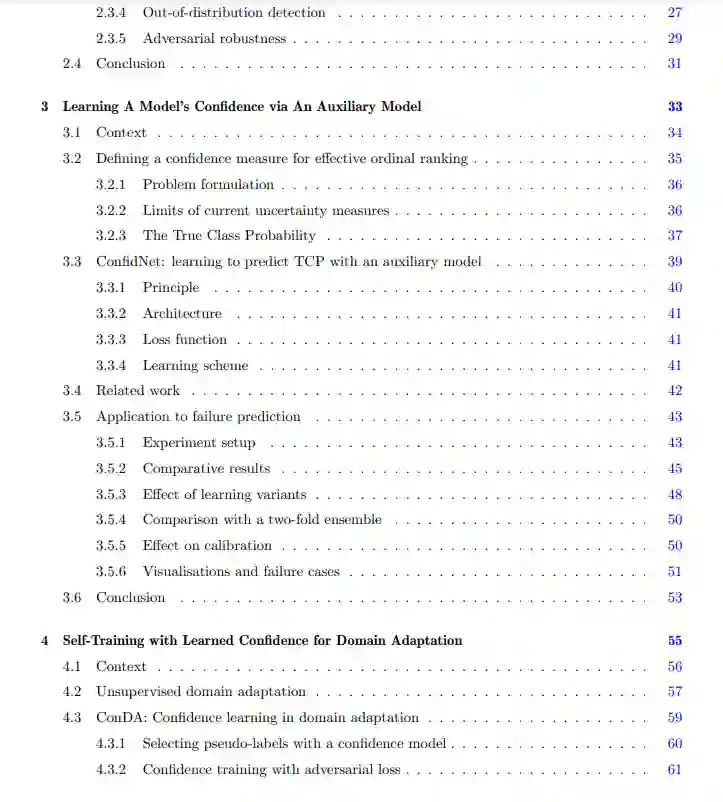 本论文的目的是开发为深度神经网络提供可靠的不确定性估计的方法工具。特别是,我们的目标是改进测试时错误预测和异常的检测。首先,我们引入了一种新的模型置信度目标准则——真类概率(TCP)。在故障预测任务中,TCP比当前的不确定性度量提供了更好的性能。由于真正的类在测试时本质上是未知的,我们提出使用辅助模型(知己网)从数据中学习TCP准则,并引入了一种适合这种情况的特定学习方案。在图像分类和语义分割数据集上验证了所提方法的相关性,证明了在故障预测方面强不确定性量化基线的优越性。