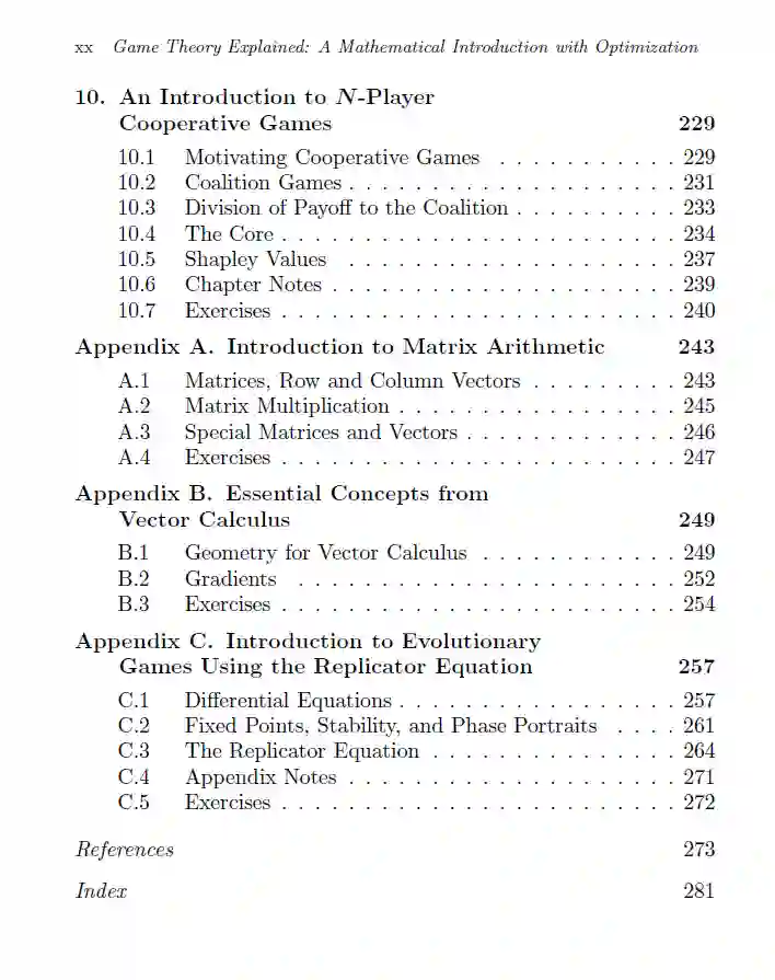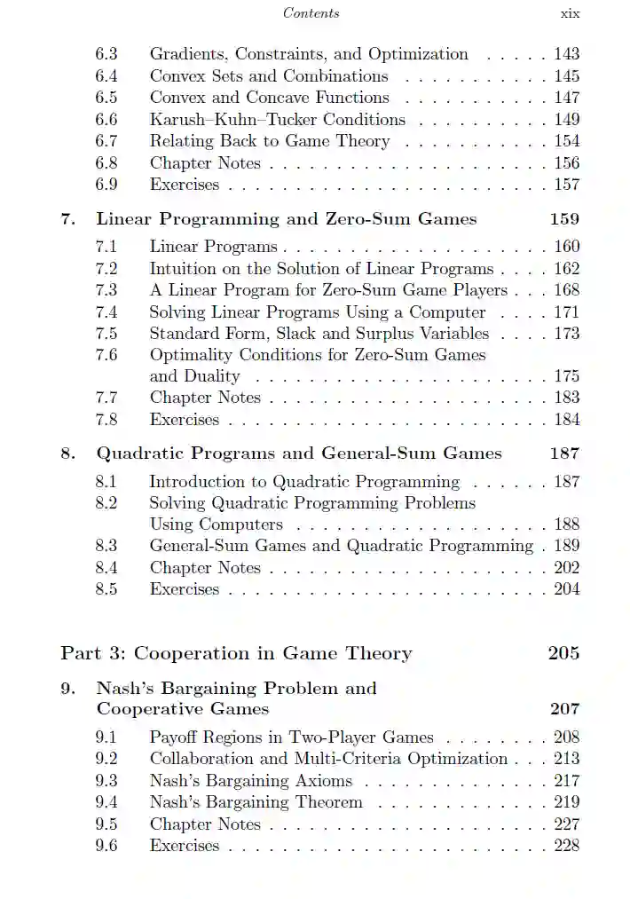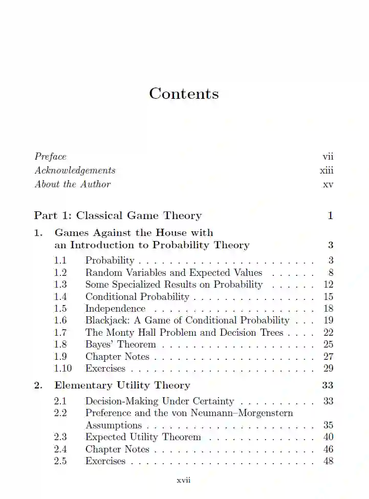本书采用经典方法与优化理论相结合的方式,系统介绍博弈论的数学理论体系。全书采用"定理-证明-示例"的教学范式,不仅聚焦博弈论核心结论,更注重论证方法的传授。 第一部分重点阐述经典博弈理论:从赌场游戏视角的概率论基础入门,到纳什一般和博弈混合策略均衡存在性证明终章,其间完整覆盖效用理论、博弈树与极小化极大定理等核心内容,辅以丰富案例解析。第二部分引入优化理论与KKT条件,系统演示如何将博弈问题重构为优化问题以实现纳什均衡计算。第三部分专论合作博弈:创新性地将纳什议价模型重塑为多目标优化问题,并运用线性规划与对偶理论重新证明经典的Bondareva-Shapley定理。 本书提供两个数学基础附录,并特别增设进化博弈专题附录(涵盖复制动力学等现代内容),便于教师灵活替换传统教学内容。作者Christopher Griffin博士作为宾州州立大学应用研究实验室教授,在应用动力系统、博弈论与优化领域具有深厚造诣,其研究成果获美国国家科学基金会等十余家机构资助,发表学术论文逾百篇。