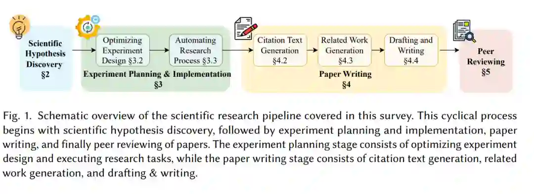 “如果我看得更远,那是因为我站在巨人的肩膀上。” —— 艾萨克·牛顿科学研究流程是启蒙时代系统性探究成就的见证 [17, 58, 58]。在这一传统范式中,科学研究涉及一系列明确的步骤:研究人员首先收集背景知识,提出假设,设计并执行实验,收集和分析数据,最后通过经过同行评审的手稿报告发现。这一循环过程促进了现代科学和技术的突破性进展,但仍受到人类研究人员所固有的创造力、专业知识、有限时间和资源的制约。几十年来,科学界一直在努力通过自动化科学研究的各个方面来增强这一过程,旨在提高科学家的生产力。早期的计算机辅助研究可以追溯到1970年代,出现了如自动数学家(Automated Mathematician)[74, 75] 和 BACON [71] 等系统,这些系统展示了机器在定理生成和经验法则识别等专门研究任务中的潜力。更近期,AlphaFold [62] 和 OpenFold [4] 等系统则展示了在某些特定研究任务中的开创性努力,显著加速了相关领域的科学进展,提升速度达到数千倍。然而,直到基础模型的出现和最近大规模语言模型(LLMs)[2, 154] 的爆发,跨多个研究领域的全面AI辅助才成为现实 [190]。近年来,LLMs取得了显著的进展,改变了AI和自然语言处理(NLP)等多个领域。这些模型,如GPT-4 [2] 和LLaMA [154],在理解、生成和与人类语言互动方面设立了新的基准。通过大规模数据集和创新架构的支持,这些模型的能力已经超越了传统的NLP任务,涉及更复杂和领域特定的挑战。尤其是LLMs处理海量数据、生成类人文本以及在复杂决策中提供支持的能力,已经引起了科学界的广泛关注 [92, 141]。这些突破表明,LLMs有潜力彻底革新科学研究的开展、记录和评估方式 [156, 165, 174]。在这篇综述中,我们探讨了LLMs当前在科学研究过程中各个阶段的应用。具体来说,我们识别了LLMs展现出显著潜力的四项任务。首先,我们探讨它们在科学假设发现中的应用,LLMs利用现有知识和实验观察来提出新的研究思路。接下来,我们回顾它们在实验规划和实施中的贡献,LLMs在优化实验设计、自动化工作流程和数据分析方面发挥了重要作用。我们还涵盖了LLMs在科学写作中的应用,包括生成引用、相关工作部分,甚至起草整篇论文。最后,我们讨论了LLMs在同行评审中的潜力,LLMs通过自动化评审和识别错误或不一致来支持对科学论文的评估。对于每项任务,我们提供了方法论、基准和评估方法的全面综述。此外,本综述还识别了每项任务中的局限性,并突出了需要改进的领域。通过分析LLMs在研究周期各阶段的贡献,本综述旨在激发研究人员探索新兴概念、开发评估指标,并设计创新方法,推动LLMs在研究工作流程中的有效整合。