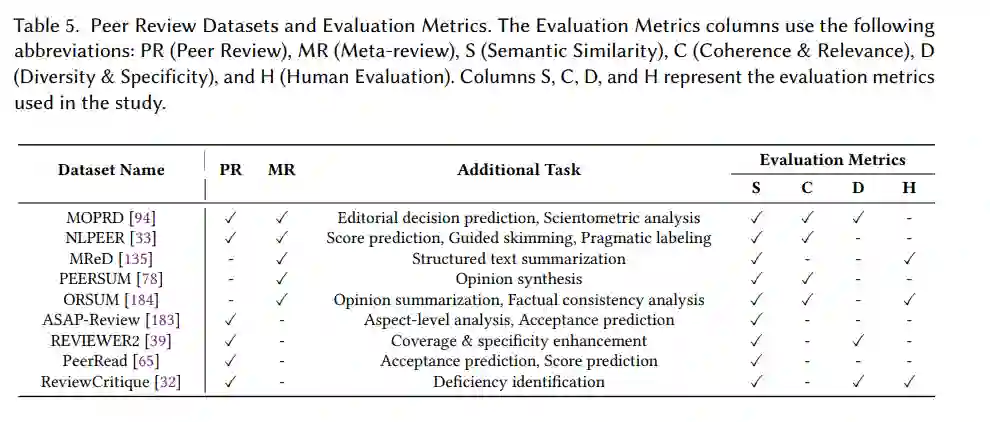 随着自动化评审生成和LLM辅助工作流程的不断发展,研究社区面临一个关键挑战:系统地评估和比较这些方法。这些基准的开发依赖于标准化的基准,评估LLM生成的评审的不同方面,从生成高质量评审到支持人类评审者的有效性。这些基准可以大致分为三种主要类型:(1)支持整体评估的综合评审数据集,包括编辑决策、评分和语用分析;(2)专注于特定方面的专门评估数据集,如意见综合和一致性分析;(3)通过缺陷识别和接受预测来衡量评审有效性的质量评估数据集。表5概述了这些关键基准及其相关的评估框架。这些数据集主要来自公开的学术会议,服务于同行评审任务中的多种目的。像MOPRD[94]和NLPeer[33]这样的综合数据集提供了广泛的覆盖范围,支持从编辑决策预测到语用标签的任务。更专门的数据集专注于评审过程的特定方面:ASAP-Review[183]和Reviewer2[39]强调接受预测和覆盖评估。最近的补充,如ReviewCritique[32],引入了比较人类和LLM生成评审的新机制。这些基准的评估框架涵盖了多个维度,如表5所详述。语义相似性衡量生成评审与参考文本的接近程度,通常使用ROUGE和BertScore等指标。连贯性和相关性评估评审的逻辑流程和主题适当性,而多样性和特异性评估提供的反馈范围和深度。人工评估,结合专家对评审质量的评估,提供了自动指标的关键验证。这四个评估组件——语义相似性、连贯性和相关性、多样性和特异性以及人工评估——形成了一个多方面的评估方法,确保全面评估LLM生成的评审在各种质量维度上的表现。