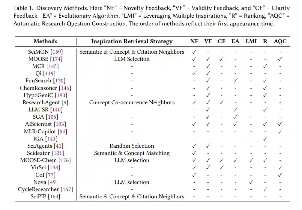 总的来说,科学发现的这一方法发展轨迹可以被视为将更多关键组件纳入方法中。表1总结了我们认为重要的关键组件,并指出每种方法是否包含这些组件。具体来说,它们是“灵感检索策略”、“新颖性检查器”、“有效性检查器”、“清晰度检查器”、“进化算法”、“利用多个灵感”、“假设排名”和“自动研究问题构建”。在这里,每个“关键组件”指的是已被证明对科学发现任务有效的详细且独特的方法论。我们排除了可能直观上有帮助但尚不清楚如何从概念中提取特定方法对该任务有效的广泛通用概念(例如工具使用)。接下来,我们介绍这些关键组件。对于每个关键组件,我们使用一到两段文字进行简要概述,总结其发展轨迹。本节中提到的每种方法的参考信息可以在表1中找到。灵感检索策略。除了依赖背景知识外,基于文献的发现(LBD)还促进了额外知识的检索,作为提出新假设的灵感来源。SciMON[159]首次将LBD的概念引入发现任务,展示了新知识可以通过现有知识的链接组成。至关重要的是,灵感不应在之前已知与背景相关,或者至少不应以已知的方式与背景相关联[176]。否则,假设将不会新颖。受经典LBD形式化中“ABC”模型的启发,给定背景知识,SciMON检索语义相似的知识、知识图谱邻居和引用图谱邻居作为灵感。具体来说,如果两个知识的SentenceBERT[127]嵌入具有高余弦相似度,则它们被识别为“语义相似”;他们构建的知识图谱遵循“[方法,用于,任务]”格式。ResearchAgent严格遵循“ABC”模型,构建概念图,其中链接表示两个连接的概念节点曾在同一篇论文中出现过。它检索与背景概念在概念图上连接的概念(概念共现)。Scideator基于语义匹配(语义学者API推荐)和概念匹配(包含相似概念的论文,同一主题、同一子领域和不同子领域)检索灵感论文。SciPIP[164]从语义相似的知识(基于SentenceBERT)、概念共现和引用图谱邻居中检索灵感。它提出了过滤方法,以过滤掉对概念共现检索无用的概念。与选择语义或引用邻居作为灵感不同,SciAgents随机抽样另一个与背景概念在引用图谱中通过长或短路径连接的概念作为灵感。MOOSE[174]提出使用LLM选择的灵感:给定研究背景和一些灵感候选者,并要求LLM从候选者中选择灵感。然后MOOSE-Chem[176]也采用了这种方法。MOOSE-Chem假设在训练了数亿篇科学论文后,最先进的LLMs可能已经具备了一定的能力来识别背景知识的灵感以组成新知识的发现。MOOSE-Chem通过注释2024年发表的51篇化学论文(这些论文仅在2024年在线提供)的背景、灵感和假设,分析了这一假设,并查看仅使用截至2023年的训练数据的LLMs是否可以在仅给出背景的情况下检索到注释的灵感。他们的结果显示检索率非常高,表明这一假设可能基本正确。然后Nova也采用了LLM选择的灵感,动机是利用LLM的内部知识来确定新想法的有用知识,应该能够超越传统的实体或关键词检索方法。反馈模块。下一个关键组件是对生成的假设在新颖性、有效性和清晰度方面的迭代反馈。这些反馈首先由MOOSE提出,受归纳推理中对假设的要求启发[113, 173]。这三个方面足够客观,可以给出反馈,并且每个方面对于一个好的假设都是必不可少的。