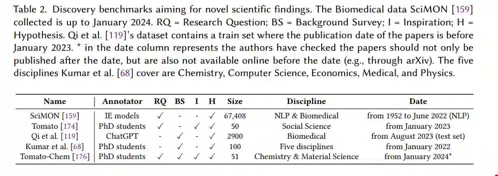 基于文献的发现通常是关于连接现有出版物中的知识(片段)并将它们关联起来以创造新知识。在这个过程中,起始知识来自研究背景。研究背景可以看作由两个部分组成:(1)一个研究问题,和(2)一个背景调查,讨论研究问题的最先进方法或知识。有了研究背景中的起始知识,其他要连接的知识通常是通过搜索现有出版物获得的。这里的其他知识被称为“灵感”[159, 174]。然后研究背景和检索到的灵感被关联起来以创建一个“假设”。 表2总结了基于文献的发现基准,旨在实现新颖的科学发现。关键组件是研究问题、背景调查、灵感识别和假设。假设从“摘要”部分[159]、“方法论”部分[174, 176]或“未来工作”和“局限性”部分[68]收集。表2还包括数据集的大小(分析的论文数量)、论文的学科和论文的发表日期。