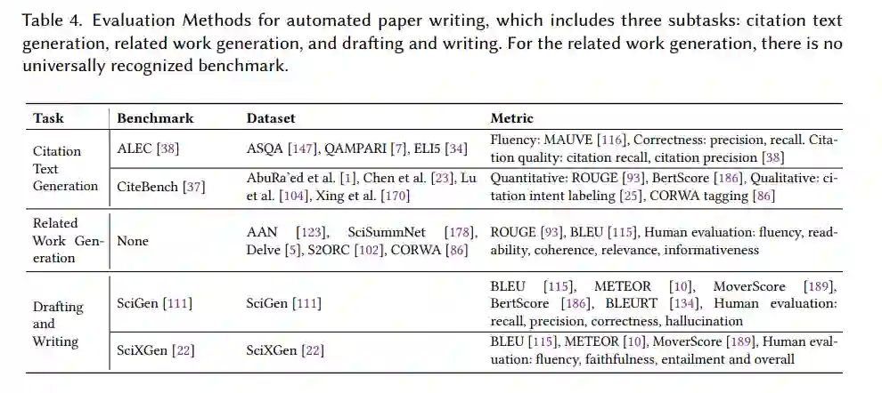 我们总结了自动化科学论文写作系统的评估方法,涵盖三个关键领域:引用文本生成、相关工作生成以及起草与写作。表4提供了每个任务的具体数据集、指标和基准的全面总结。引用文本生成。ALCE[38]基准是主要标准。它从三个维度评估系统:流畅性、正确性和引用文本的质量。ALCE旨在测试模型在不同领域中生成带有准确引用的长文本答案的能力。其数据集涵盖了从维基百科到网络规模文档集合的广泛问题类型。CiteBench[37]是另一个基准,它统一了多个现有任务,以标准化引用文本生成在不同设计和领域中的评估,使用定性和定量指标。相关工作生成。目前,没有一个单一基准被普遍认可用于此任务,因为任务定义和简化假设在各种研究中存在巨大差异[89]。然而,大多数工作都建立在语料库级数据集上,常用的科学文章来源包括:ACL Anthology Network (AAN) Corpus[123]、SciSummNet[178]、Delve[5]、Semantic Scholar Open Research Corpus (S2ORC)[102]和Citation Oriented Related Work Annotation (CORWA)[86]。摘要指标ROUGE[93]是最常用的自动评估方法,一些工作还使用了翻译指标BLEU[115]。此外,人工评估通常从流畅性、可读性、与目标论文的一致性以及引用工作的相关性和信息量等方面进行评分,采用五点Likert量表。起草与写作。SciGen[111]基准支持从科学表格中进行推理感知文本生成的评估,突显了算术推理在文本生成中的挑战。SciXGen[22]是另一个关键基准,评估上下文感知的文本生成,重点关注将外部信息集成到生成文本中。SciGen和SciXGen都使用了如BLEU[115]、METEOR[10]和MoverScore[189]等指标,以及人工评估。