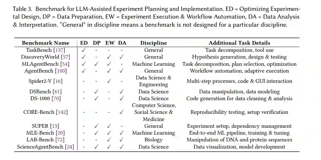 基准对于评估LLMs如何有效支持实验工作流程的各个方面至关重要。虽然并非专门为LLM辅助的实验实施创建,但许多基准足够通用,可以应用于这些任务。例如,MLAgentBench[54]涵盖了任务分解,帮助分解复杂的研究任务,数据处理,自动化数据加载和转换等过程,以及工作流程管理,优化机器学习实验执行。这些基准提供了不同的途径,因此在方法上有所不同。评估方法从任务成功率、准确性和执行一致性到与人类基准的比较。这些差异突出了LLMs可以集成到研究过程中的多种方式。表3中提供了更多详细信息。