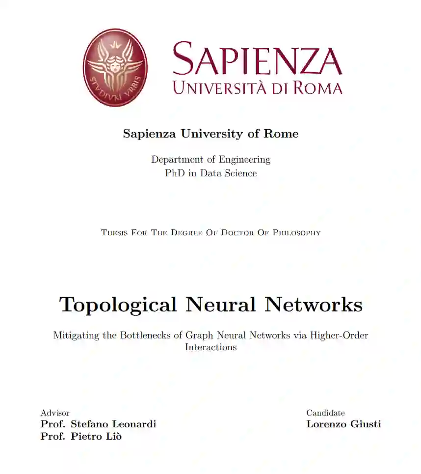 自然现象的不可约复杂性促使图神经网络成为执行图结构数据上表示学习任务的标准模型。尽管它们捕捉局部与全局模式的能力十分出色,但与长距离和高阶依赖相关的问题为这些模型带来了相当大的挑战。本工作通过首先识别负面影响图神经网络在学习强依赖于长距离交互事件的表示时性能的各个方面,来应对这些挑战。特别是,当图神经网络需要在远距离节点之间聚合消息时,消息传递机制会将指数级增长的信息量过度压缩到静态向量中。 值得注意的是,对于某些类别的图(即路径、树、网格、环形和梯形),底层的连通性允许消息沿着边缘传递,而不会遇到来自其他路径的显著干扰,从而将信息的增长量控制在线性级别上。 当底层图不属于上述类别时,会出现过度压缩现象,因为信息的传播发生在通过边缘相连的节点之间,这导致了计算图反映节点的连通性。这一现象导致节点对来自图远端的信息变得不敏感。为了提供一种缓解此类瓶颈的新架构设计视角,一个统一的理论框架揭示了网络的宽度、深度和图拓扑对消息传递神经网络中过度压缩现象的影响。 然后,论文转向通过拓扑神经网络利用高阶交互。凭借多关系归纳偏见,拓扑神经网络通过更高维度的结构传递消息,有效地提供信息流的快捷方式或额外路线。通过这种构建,底层的计算图不再与输入图结构耦合,从而缓解了上述瓶颈,同时也考虑了高阶交互。受到图注意力网络中开发的掩蔽自监督学习机制以及由单纯形和胞腔复合体提供的丰富连通性的启发,提出了两种不同的注意力架构:单纯形注意力网络和胞腔注意力网络。 这些架构背后的理念是利用特定排列的节点组内单纯形或胞腔复合体提供的扩展邻域概念。特别是,这些拓扑注意力网络利用底层复合体的上下邻接性来设计能够衡量来自不同区域信息重要性的各向异性聚合。通过这样做,它们捕捉到传统图神经网络可能错过的依赖关系。 最后,通过增强的细胞同构网络引入了一个高阶结构之间的通信方案,它通过让一个胞腔复合体的所有细胞从它们的下层邻域接收消息来增强拓扑消息传递方案。这种升级使得在胞腔复合体内的节点组之间,特别是以环状结构排列的,能够直接互动。这种增强的方案为高阶和长距离交互提供了更全面的表示,展示了在大规模和长距离基准测试上的非常高性能。 在深度学习的不断演进的景观中,数据中存在的关系模式已变得至关重要,用以解决图结构数据的表示学习任务。本论文从这一视角出发,探索了拓扑神经网络的领域,强调了代数拓扑学领域的概念与在离散拓扑空间上执行表示学习任务之间的协同作用。本工作的目标结构旨在确保在理解高阶交互及其在推进神经架构方面的角色上具有深度和广度。