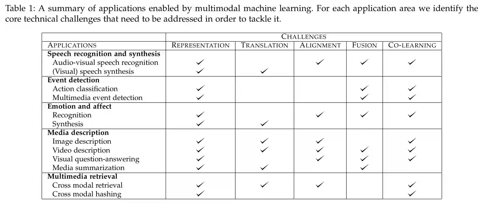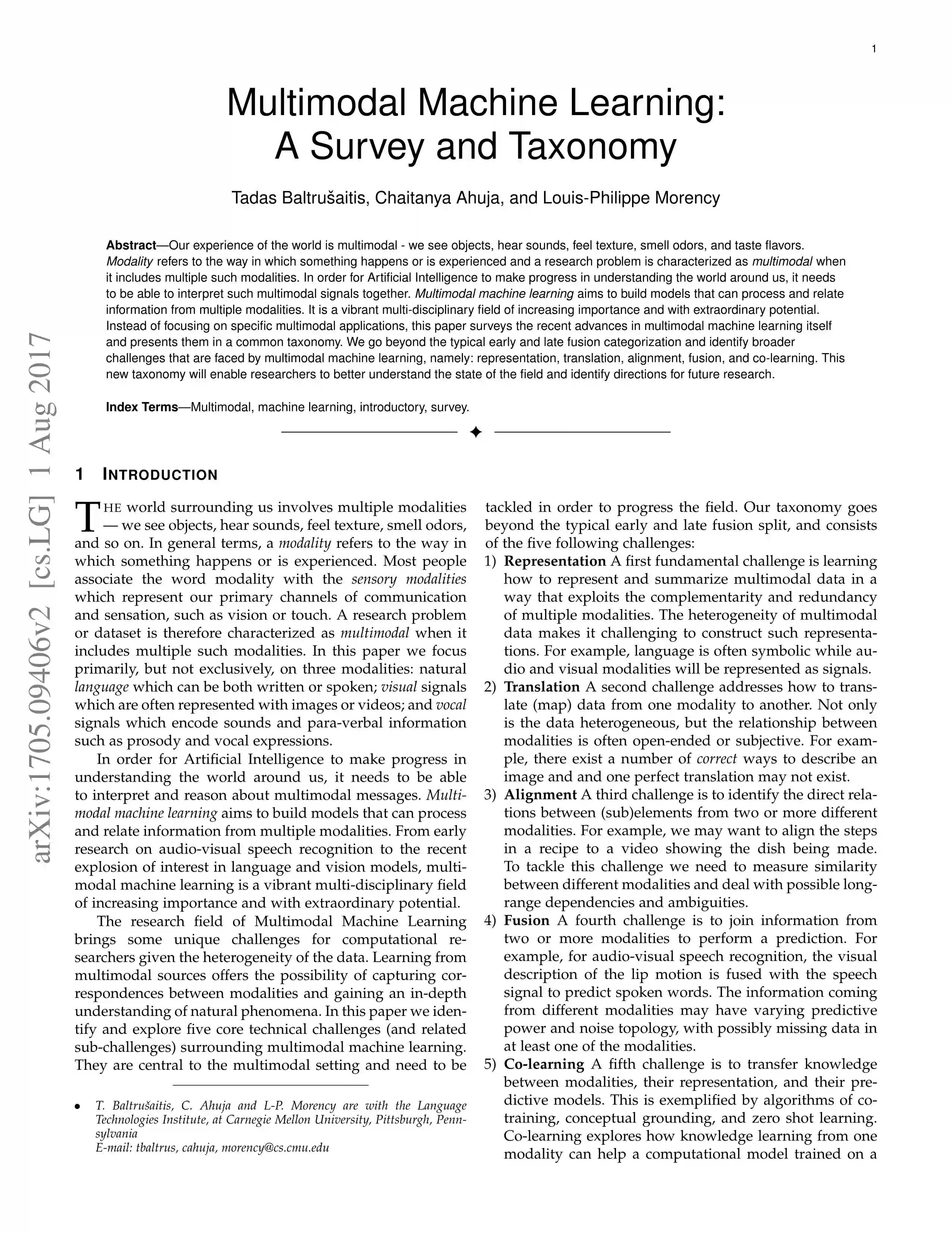 人工智能领域最顶级国际期刊IEEE Transactions on Pattern Analysis and Machine Intelligence(IEEE TPAMI,影响因子为 9.455),2019年1月最新一期发表了关于多模态机器学习综述论文。我们周围的世界涉及多种形式 - 我们看到物体,听到声音,感觉质地,闻到异味等等。 一般而言,模态指的是事物发生或经历的方式。 大多数人将形态与感觉方式联系起来,这些感觉方式代表了我们主要的交流和感觉渠道,例如视觉或触觉。 因此,当研究问题或数据集包括多个这样的模态时,其特征在于多模态。 本文主要关注但不仅仅关注三种形式:自然语言既可以是书面的,也可以是口头的; 视觉信号,通常用图像或视频表示; 和声音信号,编码声音和口头信息,如韵律和声音表达。
