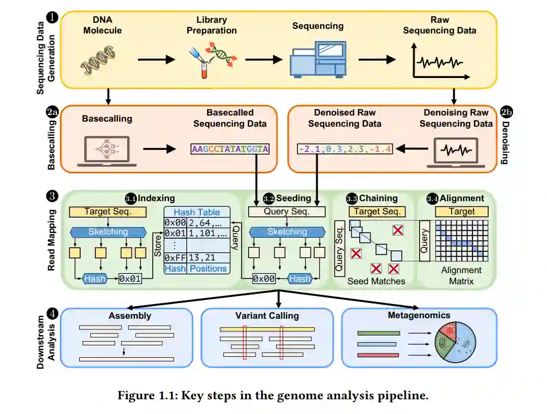 高通量测序(HTS)技术的出现彻底改变了基因组分析,使得大规模基因组的快速且经济高效的测序成为可能。尽管取得了这些进展,基因组数据的复杂性和数据量的不断增加仍然带来了与准确性、可扩展性和计算效率相关的重大挑战。这些挑战主要源于测序数据中各种形式的不必要和未处理的变异,统称为噪声。解决这些挑战需要深入理解基因组数据中不同类型的噪声,并开发技术以减轻噪声对基因组分析的影响。 在本论文中,我们旨在理解影响基因组分析流程的噪声类型,并通过开发新的计算技术来容忍或减少噪声,从而实现对不同类型测序数据(例如纳米孔测序的原始电信号)更快、更准确和可扩展的分析。 首先,我们介绍了BLEND,一种噪声容忍的哈希机制,能够通过单次哈希值查找快速识别完全匹配和高度相似但存在任意差异的序列。其次,为了实现可扩展且准确的噪声原始纳米孔信号分析,我们提出了RawHash,这是一种新颖的机制,通过提出首个基于哈希的原始纳米孔信号相似性搜索技术,有效减少原始纳米孔信号中的噪声,并实现准确的实时分析。第三,我们通过RawHash2扩展了RawHash的功能,这一改进机制:1)更好地理解原始纳米孔信号中的噪声以更有效地减少噪声;2)提高映射决策的鲁棒性。第四,我们通过引入Rawsamble探索了原始纳米孔信号分析的更广泛影响和新应用。Rawsamble是首个使用基于哈希搜索的原始信号全对全重叠机制,能够直接从原始信号构建从头组装,而无需进行碱基识别,这为原始纳米孔信号分析开辟了新的方向和应用。