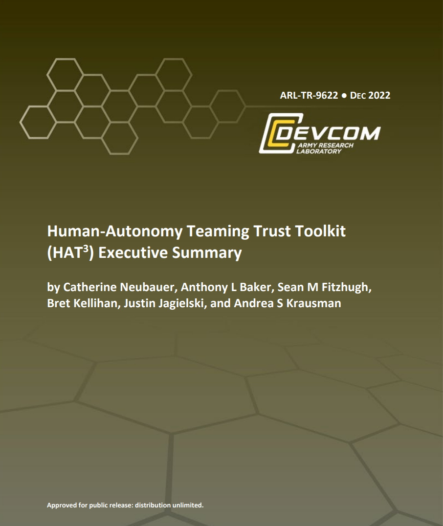 随着越来越多地强调在未来的作战行动中整合人类和自主系统,美国陆军作战能力发展司令部(DEVCOM)陆军研究实验室(ARL)建立了人类自主团队基本研究计划(HAT ERP)。HAT ERP的目标是解决在复杂的战术环境中人类和自主系统的合作所面临的挑战,以创建有效运作的协同团队,并适应战斗的动态性质。在HAT ERP的项目5中,正在解决的一个具体领域是如何有效地衡量关键的团队过程,如信任和凝聚力。因此,HAT项目5的总体目标是开发新的、多模态的团队信任和凝聚力指标,以有效地校准信任并提高支持下一代战斗车辆(NGCV)的人类自主团队的性能。HAT项目5更具体的目标包括:1)确定非侵入性的、实时/近实时的信任度量,以捕捉团队信任的动态性质;以及2)为适当的信任干预提供信息,以便对个人和团队信任进行适当校准。