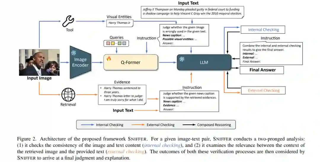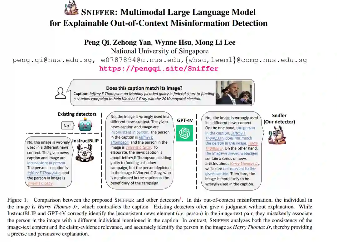谣言是一个普遍的社会问题,因其潜在的高风险而受到关注。脱离上下文(OOC)的谣言,即将真实图片与虚假文本结合,是误导受众的最简单也是最有效的方式之一。现有方法侧重于评估图文一致性,但缺乏令人信服的解释来支持其判断,这对于揭穿谣言至关重要。尽管多模态大型语言模型(MLLMs)具有丰富的知识和天生的视觉推理及解释生成能力,但它们在理解和发现微妙的跨模态差异方面仍然缺乏成熟。在本文中,我们介绍了SNIFFER,这是一个专为检测和解释OOC谣言而特别设计的新型多模态大型语言模型。SNIFFER采用了基于InstructBLIP的两阶段指导微调。第一阶段细化模型对通用对象与新闻领域实体的概念对齐,第二阶段利用仅限语言的GPT-4生成的OOC特定指令数据来微调模型的鉴别能力。通过外部工具和检索增强,SNIFFER不仅能够检测文本和图像之间的不一致性,而且还利用外部知识进行情境验证。我们的实验表明,SNIFFER的性能超过了原始MLLM 40%以上,并且在检测准确性方面超过了最先进的方法。SNIFFER还提供了准确和有说服力的解释,经过量化和人类评估验证。