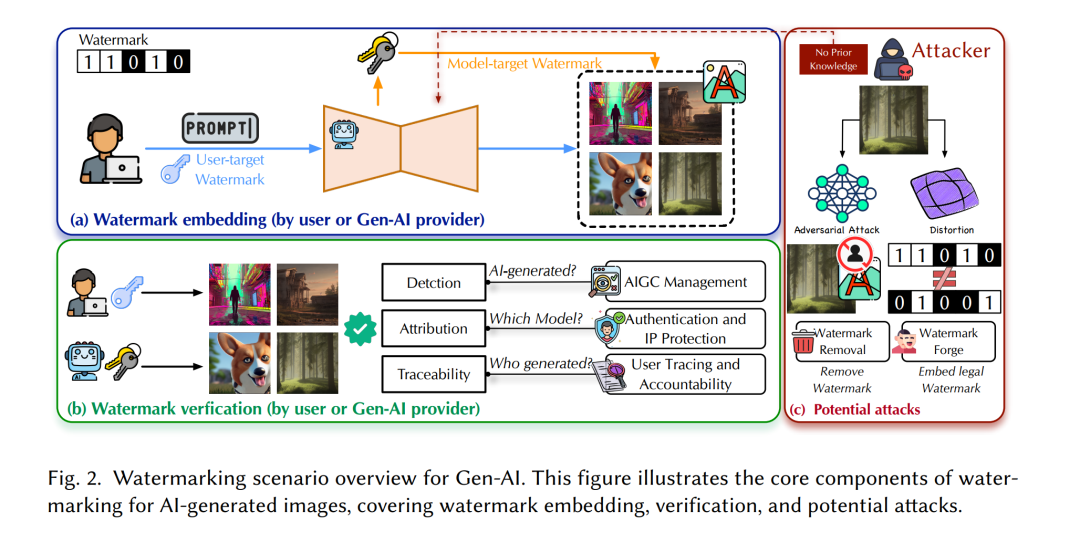 数字水印(Digital Watermarking)是一种在数字媒体中嵌入可见或不可见标识信息的技术,用于验证内容真实性、确立所有权并支持溯源追踪。同时,它也是区分自然内容与 AI 生成内容、确保数字生态系统中责任可追溯性的重要手段【43】。 典型的数字水印过程包括两个阶段:嵌入(embedding)验证(verification)。在嵌入阶段,水印被嵌入图像中,同时尽量保持视觉质量;在验证阶段,通过提取水印并与参考水印或密钥比对,以确认内容的真实性或所有权。 然而,传统水印方法存在显著局限: (1) 由于水印未与图像生成过程集成,易受到几何攻击等干扰; (2) 作为后处理手段(post-hoc method),其水印与生成图像缺乏语义一致性,无法充分利用生成模型的潜在特征。 为克服这些问题,生成中水印(in-generation watermarking)作为一种主动式策略被提出。该方法允许 Gen-AI 用户或模型提供方在生成过程中直接嵌入隐藏信息或密钥(即水印),从而在保证图像语义与视觉质量的同时,实现知识产权保护、内容认证与责任追溯。如图 2 所示,该过程通过在生成结果中嵌入隐蔽但一致的信号来标记其生成源。后续可通过检测该信号实现真实性验证,而无需依赖统计差异。这种方式为识别与管理 AI 生成图像提供了一种更可靠的手段。 全球范围内,多个国家与地区正积极推进 Gen-AI 水印的立法与标准化: * 中国已明确要求对 AIGC 内容进行水印标识,以确保可追溯与监管【9】; * 欧盟通过《人工智能法案(AI Act)》【14】建立了涵盖机器可读水印的透明度要求; * 美国采用混合模式,结合行政命令【68】、NIST 指南【51】与行业自愿标准,推动水印机制的落地。