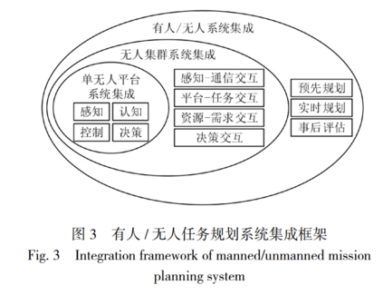 在复杂环境中, 环境动态性和任务多样性给无人集群自主协同、有人系统与无人集群协同带来了巨大挑战. 为此, 提出了 有人 / 无人集群任务规划系统集成框架. 该框架集成无人平台自主行为规划系统, 无人集群分布式系统与有人 / 无人集群系统. 无 人平台通过感知、认知、决策与控制完成自主行为规划. 无人平台间通过交互信息, 彼此决策方式协同规划. 有人系统支持在预先 规划、实时规划与事后评估阶段与无人集群的协同交互.