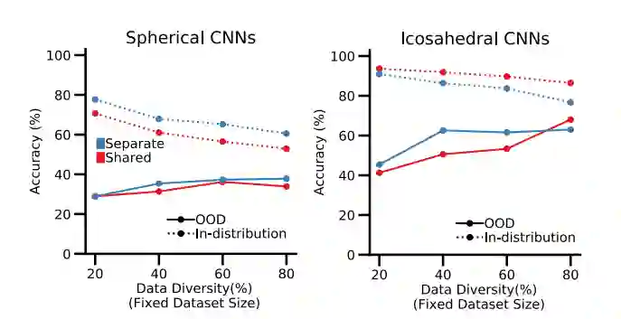 随着分布内组合数量的增加,OOD组合的类别识别精度和视点估计精度的几何平均值。(a)使用球形CNN (Cohen et al., 2018)作为骨干的独立和共享架构的准确性,(b)使用二十面体CNN (Cohen et al., 2019)作为骨干的准确性。 这是研究人员希望在未来工作中探索的一个领域。他们想看看他们是否可以迫使神经网络发展出具有这种专业化的神经元。他们还希望将他们的方法应用于更复杂的任务,例如具有复杂纹理或不同照明的物体。