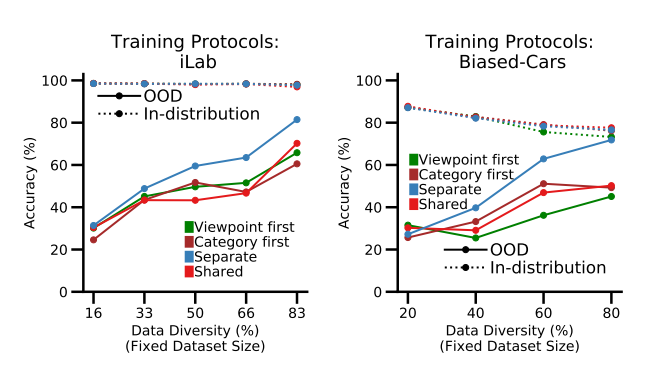 除分离和共享协议外,ResNet-18骨干的其他训练协议的泛化性能。本文报道了随着分布组合数量的增加,OOD组合的类别识别精度和视点估计精度的几何平均值。对于这些,我们首先在一个任务上训练共享网络,观点优先或范畴优先。然后,我们从第一个任务中学习到的这些特征开始训练第二个任务。我们将它们与主论文中提出的共享和分离训练协议进行了比较。(a) iLab数据集的精度,(b) Biased-Cars数据集的精度。 但研究人员发现事实恰恰相反——为每项任务单独训练的模型比同时为两项任务训练的模型能够更好地克服偏置。