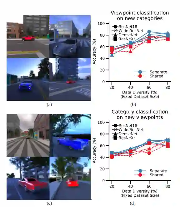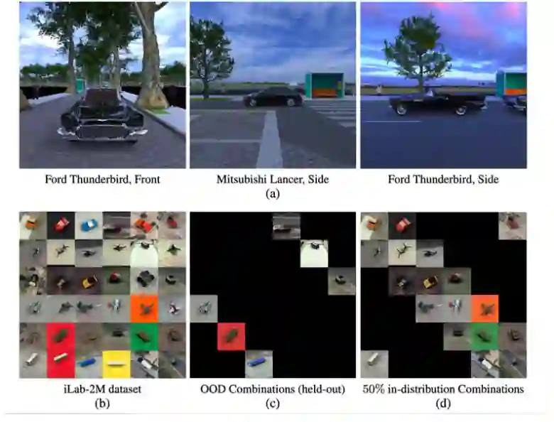 Category-Viewpoint数据集。(a)我们新的Biased-Cars数据集: 一个仅从正面显示福特雷鸟和从侧面显示三菱兰瑟的网络,能否对从侧面看到的雷鸟进行分类? (b) iLab-2M数据集(Borji等人,2016): 每个单元格代表一个独特的类别-视点组合(行与列之间的类别不同,视点与列之间不同),每个类别和背景有多个对象实例。(c)类别-视点组合held-out测试集。用相同的保留度测试集来评估用不同数量的分布内组合训练的网络。(d)有偏置的训练集,有50%的类别-视点组合。选择的类别和观点的数量总是相等的。