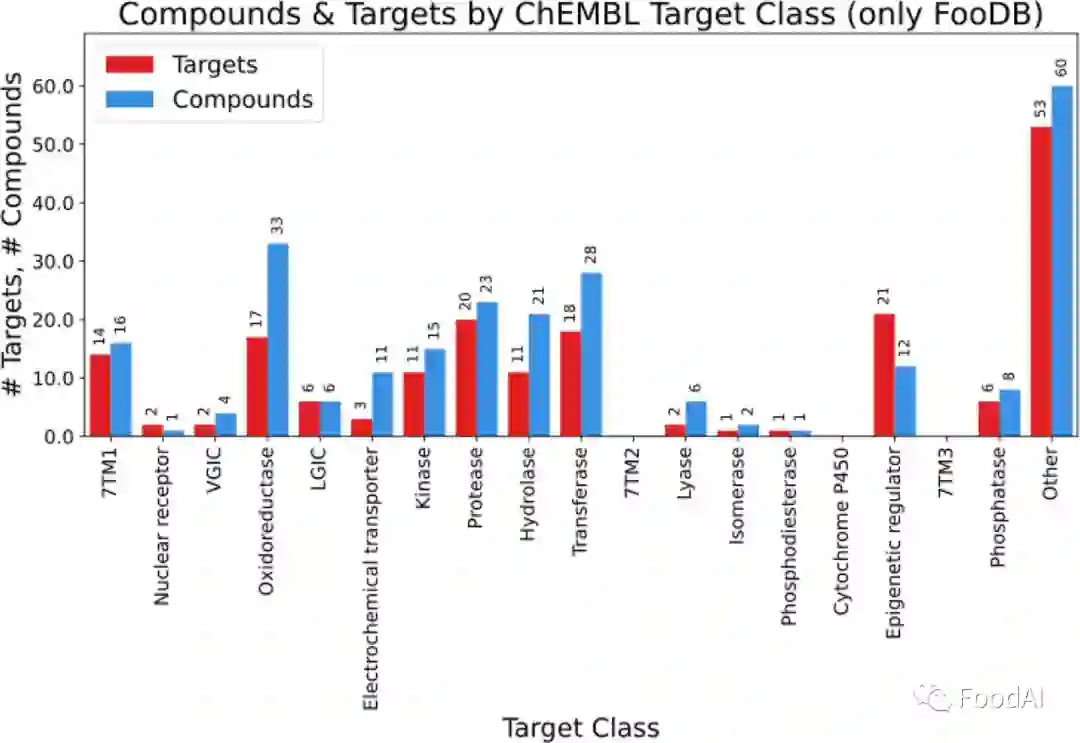 图3. 仅与 FooDB 化合物相互作用的靶点类别中靶点(红色条)和化合物(蓝色条)的分布