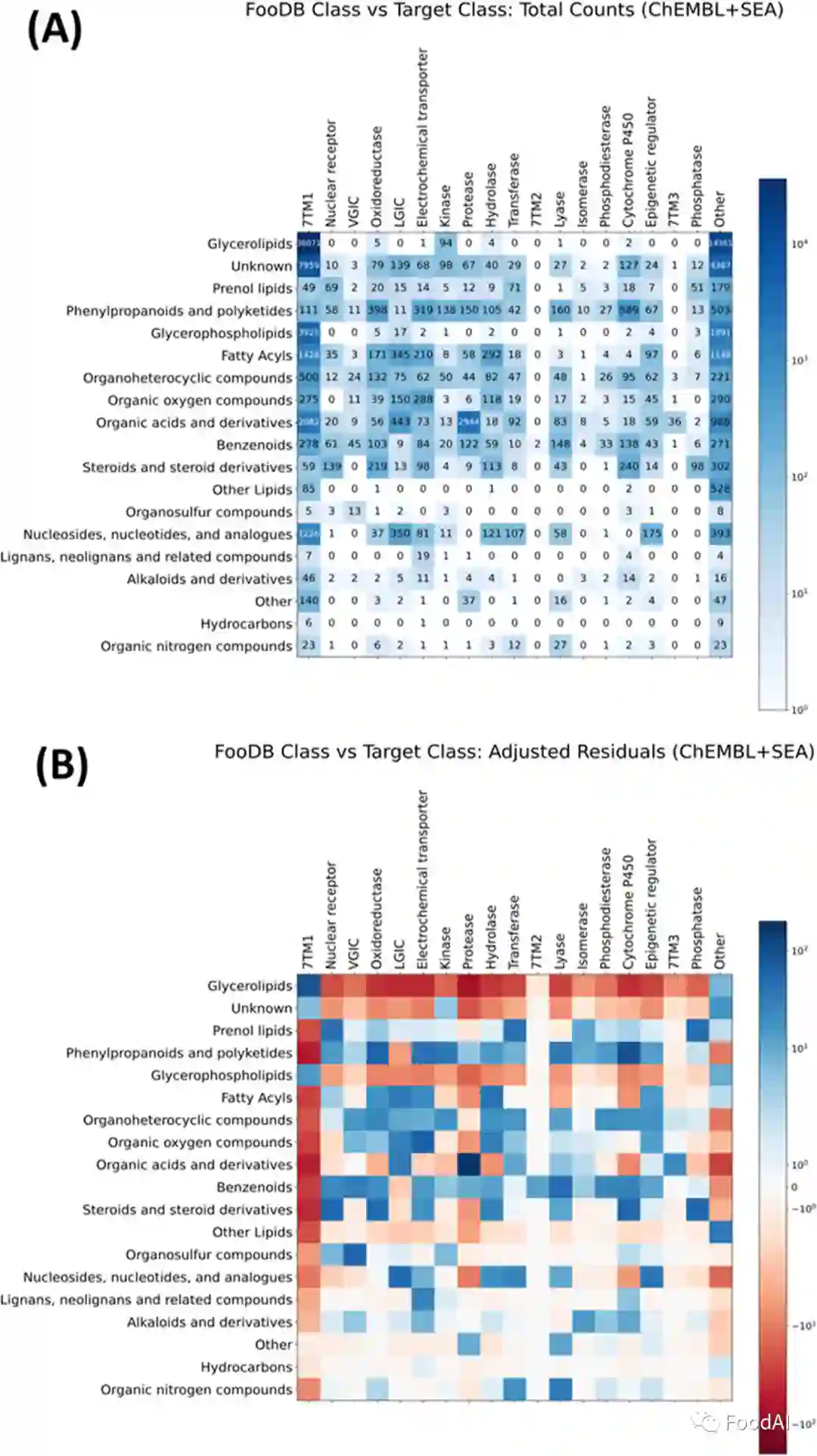 图5. 已发布的 FooDB 分布以及复合类和靶点类之间的预测(总)相互作用。从 ChEMBL 中检索的已发布相互作用,以及使用 SEA + TC 方法获得的预测相互作用,如方法中所述。(A) 计数分布;(B) 调整残差(见方法)。后者的色带使用了对称的对数刻度,中心线性范围为 -5 到 +5。