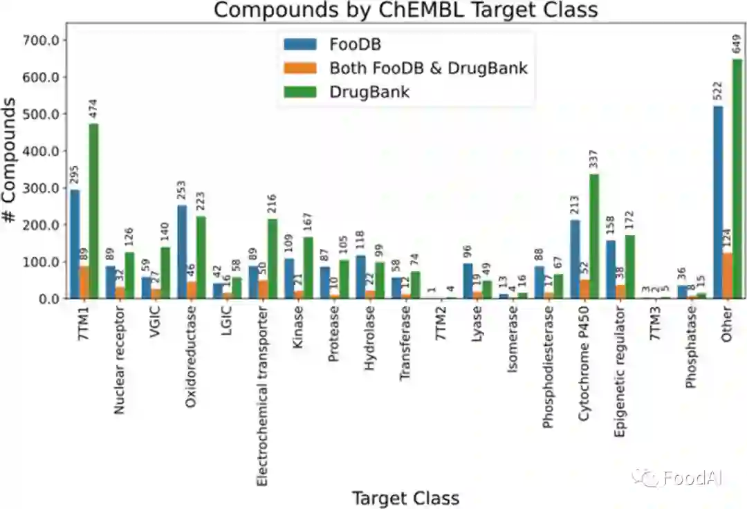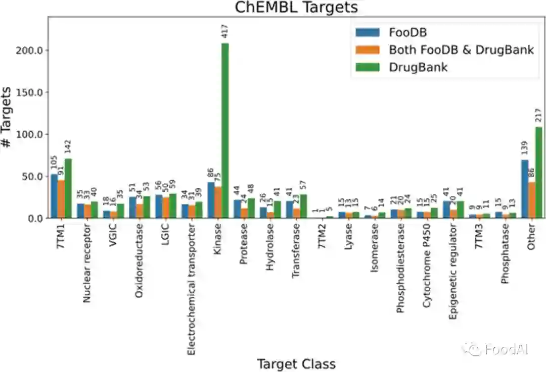 图 2. FooDB(蓝色条)、DrugBank(绿色条)及其交叉点(橙色条)中公布的化合物相互作用的靶点类别中化合物的分布