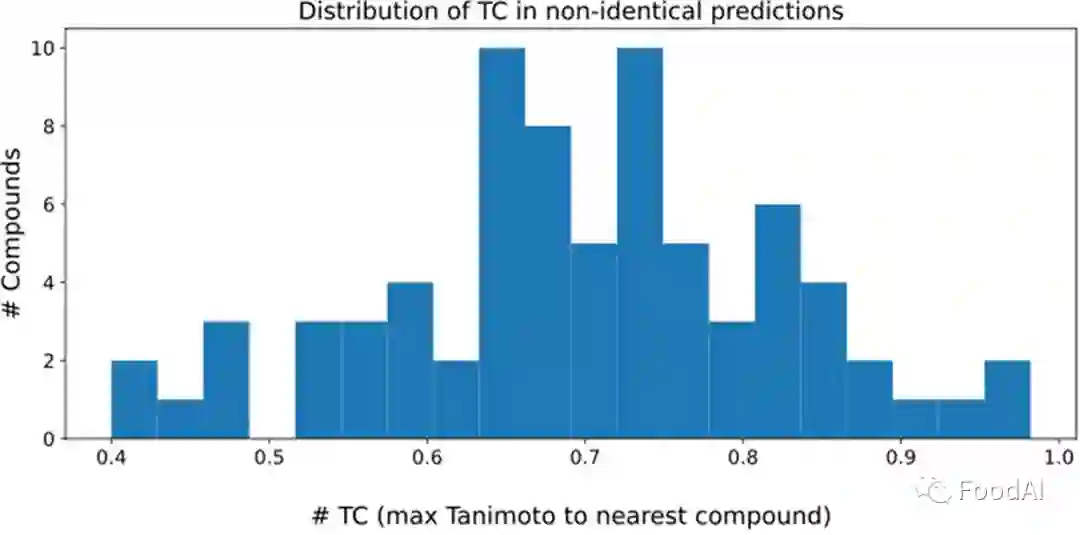 对于 75 种化合物的子集,TC 值 <1,这对应于基于不同化合物的预测。因此,图 9显示了这 75 个预测的分布直方图,其中可以观察到已确认的预测基于低至 0.4 的 TC 值(本文的 SEA + TC 方法设置允许的最低 TC)。