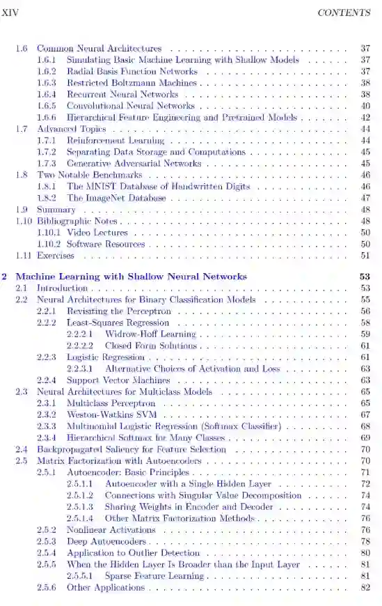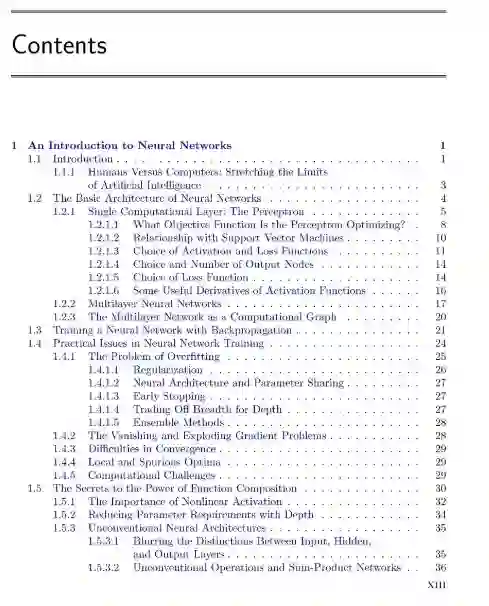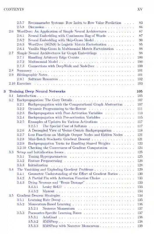 神经网络基本知识: 许多传统的机器学习模型可以理解为神经网络的特殊情况。前两章重点介绍了传统机器学习与神经网络之间的关系。支持向量机、线性/逻辑回归、奇异值分解、矩阵分解和推荐系统被证明是神经网络的特殊情况。这些方法与最新的特征工程方法如word2vec一起被研究。