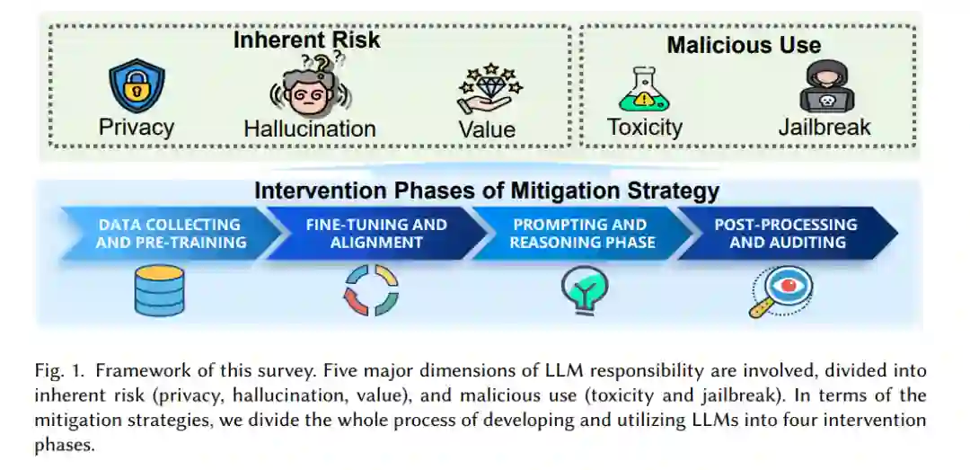 总体而言,我们将LLMs的潜在危险和脆弱性分为两类,即固有风险和恶意使用(见图1)。就固有风险而言,LLMs可能会暴露其用于预训练或微调的语料库中的敏感信息,从而引发隐私泄露问题 [37, 145, 226]。同时,众所周知,LLMs可能会出现幻觉现象,导致生成不准确和误导性的文本 [194]。最后,由于LLM生成文本中嵌入的价值通常直接反映了其训练数据的分布,这些数据通常来自互联网,因此LLMs可能会过度拟合于某一狭窄的价值集,甚至放大不良和不道德的内容,从而导致价值不匹配。在恶意使用方面,LLMs可能被用来生成有害内容,如仇恨言论、骚扰、网络欺凌,对人类造成伤害 [25]。此外,恶意用户可能会越狱LLMs,绕过其安全限制,进行欺诈性目的 [123, 225]。在缓解策略方面,我们将开发和使用LLMs的全过程分为四个阶段,即数据收集与预训练、微调与对齐、提示与推理、后处理与审计,并根据操作的阶段对现有研究进行分类。 在本文中,我们系统总结了近期在构建负责任LLMs方面的研究进展,涵盖了在隐私保护、幻觉减少、价值对齐、有害性消除和破解防御等方面增强LLM性能的技术。与现有的综述不同,后者主要关注单一维度以改善LLM的责任性(例如隐私 [37, 145, 226] 或幻觉 [194]),我们的综述采用统一框架,分析并比较涵盖更广泛维度的现有研究。这一全面的分析有助于我们理解这些不同维度之间的共性和差异,从而更深入地了解构建负责任LLMs的现状和未来方向。 本综述的结构如下:第二节回顾与负责任LLMs相关的现有综述,并对比它们与本文的主要区别;第三节正式介绍并比较构成LLM准备和应用过程的四个阶段;接下来的第四至第八节分别详细介绍现有研究在隐私保护、幻觉减少、价值对齐、有害性消除和破解防御方面的成果;最后,第九节总结负责任LLMs的开放挑战和未来方向,第十节对本文进行总结。