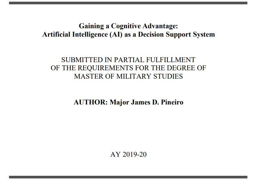 海军陆战队不能再依赖过时的决策支持系统和信息管理方法来进行战术决策。随着友军和敌军利用技术获取战术利益,指挥官的信息负荷将继续增加。人工智能决策支持系统可以解决这个问题。军事指挥与控制发展计划》(MCDP 6)指出了这一点的必要性:"无论时代或技术如何发展,有效的指挥与控制都将归结为人们利用信息做出明智的决定和行动....,衡量指挥与控制有效性的最终标准始终如一:它能否帮助我们比敌人更快、更有效地采取行动?