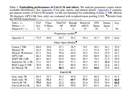 值得注意的是,我们的公式支持不同数量的嵌入样本(M)和生成样本/令牌(N)。这允许显著增加嵌入批量大小,同时保持生成批量大小固定。大的嵌入批量大小通常是文本嵌入模型表现良好的关键[169]。然而,这需要在每一步都增加更多的计算成本。实验GRIT带来了最先进的嵌入和生成模型。我们在表1和表2中对GRITLM 7B、GRITLM 8X7B以及仅生成和仅嵌入的变体与其他模型进行了基准测试。我们发现GRITLM 7B在Massive Text Embedding Benchmark[107]上超过了所有先前的开放模型,同时在其大小为70亿参数的所有生成模型中仍然表现优异。GRIT模型是唯一能够在嵌入和生成上都实现最佳性能的模型(图1)。例如,使用Llama 70B[154]进行嵌入在MTEB上仅得到35.6的分数,如表1所示。GRITLM几乎将MTEB上的性能翻倍,达到最先进的性能,同时在生成任务上的表现也超过Llama 70B 20%以上(表2)。进一步扩大规模,GRITLM 8X7B在我们的生成平均上超过了所有公开可用的模型。我们还训练了仅使用表征或生成指令调整的GRITLM的嵌入仅和生成仅变体,但在其他方面相同。在表2中,仅通过重新添加在嵌入微调期间去除的语言建模头,将嵌入仅变体或SGPT BE 5.8B[104]在生成任务上进行基准测试,导致性能几乎是随机的(MMLU上的随机基线为25.0)。同样,基准测试仅生成模型的嵌入性能仅在表1中得到41.2的分数。因此,通过GRIT方法的联合优化对于同时实现嵌入和生成的强大性能至关重要。然而,我们注意到,拥有70亿参数的GRITLM 7B运行成本显著高于表1中的许多其他嵌入模型,例如仅有3.35亿参数的BGE Large[169]。此外,GRITLM 7B产生的表示为4096维,需要比BGE Large的1024维嵌入多4倍的存储空间。