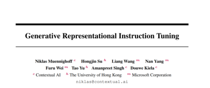 所有基于文本的语言问题都可以归结为生成任务或嵌入任务。当前模型只在其中一项上表现良好。我们引入了生成式表征指令调整(Generative Representational Instruction Tuning,简称GRIT),通过指令区分生成任务和嵌入任务,训练大型语言模型来同时处理这两种任务。与其他开放模型相比,我们的GRITLM 7B在Massive Text Embedding Benchmark(MTEB)上设立了新的最佳状态,并且在一系列生成任务上超越了所有大小相当的模型。通过进一步扩大规模,GRITLM 8X7B超过了我们尝试的所有开放生成语言模型,同时仍然是最好的嵌入模型之一。值得注意的是,我们发现GRIT匹配仅在生成或嵌入数据上的训练,因此我们可以在不损失性能的情况下统一这两者。除了其他好处,通过GRIT统一,对于长文档的检索增强生成(Retrieval-Augmented Generation,简称RAG)速度提高了60%以上,不再需要单独的检索和生成模型。模型、代码等资料可在https://github.com/ContextualAI/gritlm上免费获取。
