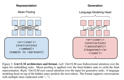 其中f是由模型θ参数化的GRITLM,τ是一个温度超参数,σ对应于应用于每个输出的池化,随后是余弦相似度。q和d分别是查询和文档样本。如图3所示,我们使用双向注意力,随后是均值池化,这相当于在序列长度上平均隐藏状态。在池化过程中,我们只平均输入样本的最终隐藏状态,忽略指令和格式化令牌。然而,指令和格式化令牌通过自注意力机制[156]仍然影响最终表示。