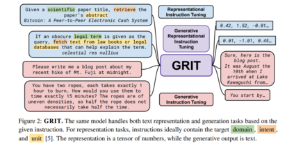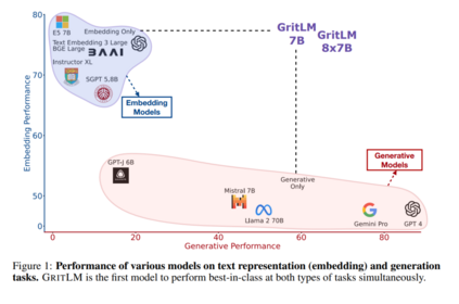 创建一个在广泛任务范围内表现良好的单一通用模型,一直是人工智能领域的长期目标[73, 67, 21, 130, 139]。最近,大型语言模型(Large Language Models, LLMs)已成为单一多任务模型的有希望方向[125, 13]。先前的工作认为,所有基于文本的语言问题都可以简化为生成问题,因此可以通过单一LLM处理[128, 38]。然而,使用嵌入的任务,如聚类或检索[107],从这一视角大多被忽视。如今,文本嵌入支持许多关键的现实世界应用,从搜索引擎到面向用户的聊天机器人[63, 144]。虽然将文本嵌入整合到生成范式中是可能的,通过生成一系列数字来形成嵌入张量,但由于嵌入的高维度和精度要求,这变得不切实际。因此,更常见且更容易的做法是使用模型的隐藏状态作为嵌入表示,这已经是一个数值张量[104, 158, 102]。然而,对当前生成模型这样做会导致性能不佳。例如,虽然T5模型[128, 134]可以以序列到序列的方式处理任何生成任务,但它需要微调才能使其隐藏状态对文本嵌入有用[111, 112],在此过程中它失去了生成能力。我们引入GRIT(生成性表征指令调整),将嵌入和生成任务统一起来,导致一个在两个任务上都表现出色的模型,如图1所示。图2展示了GRIT如何结合两个之前分离的训练范式:(1)生成性指令调整,模型通过生成一个答案来响应指令进行训练[164, 134];和(2)表征性指令调整,模型根据指令代表提供的输入进行训练[143, 5]。通过指令和分离的损失函数,模型学会区分这两种流。我们在高达47B参数的模型上测试我们的方法,并且由于其简单性,我们期望该方法能泛化到任何LLM,甚至非变换器模型。通过GRIT的统一带来了三个优点:a)** 性能**:我们的统一模型匹配了仅嵌入和仅生成变体的性能,甚至在某些任务上超越它们。在7B参数下,GRITLM在开放模型中在Massive Text Embedding Benchmark[107]上设定了新的艺术状态,并同时在生成任务上超越了更大的模型,如Llama 2 70B。通过进一步扩展,GRITLM 8X7B是我们任务平均上最好的开放生成语言模型,同时仅在推理时使用13B参数。此外,由于我们的模型使用滑动窗口注意力[20, 9],它们可以处理任意长度的生成和嵌入输入。b)** 效率**:通常一起使用生成和嵌入模型来弥补彼此的不足[56, 84]。一个这样的场景是检索增强生成(RAG)[84],其中使用嵌入模型检索提供给生成模型以回答用户查询的上下文。这需要将用户查询和上下文传递给生成模型和嵌入模型,共计四次前向传递。有了GRITLM,嵌入和生成模型是等价的,允许我们缓存计算并将所需的前向传递次数减半。我们发现这可以使长文档推理时的RAG速度提高60%以上。c) 简单性:目前,如OpenAI这样的API提供商提供单独的生成和嵌入端点。这需要单独的负载平衡、额外的存储和更复杂的服务软件。一个同时处理两种用例的单一模型显著简化了基础设施需求。GRIT的主要缺点是由于使用两个目标函数进行训练,它需要更多的计算。然而,由于微调与预训练相比成本较低,我们认为好处远远超过这个问题,因此建议构建遵循指令的语言模型的实践者在微调期间采用GRIT。