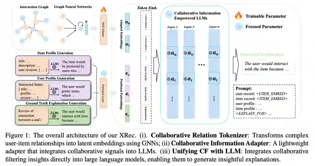 推荐系统主要提供与用户偏好相匹配的个性化推荐信息,而协同过滤(CF)是当前推荐领域广泛采用的一种方法。尽管图神经网络(GNNs)和自监督学习(SSL)等先进技术使CF模型可以生成更好的用户表示,但是这些技术往往缺乏为所推荐的物品生成文本解释的能力。可解释推荐技术旨在填补这一空白,通过提供推荐决策过程的解释,增强用户对所推荐物品合理性的理解程度。本文提出了一种与模型无关的可解释推荐框架XRec,利用LLMs强大的语言能力,为推荐系统中的用户行为提供更加全面的解释。通过整合协同信号并设计轻量级的协同适配器,该框架使LLMs能够理解用户-项目交互中的复杂模式,并深入理解用户偏好。本文通过大量的实验展示了XRec的有效性,证明其生成全面且有意义的解释的能力,超越了传统的可解释推荐系统。