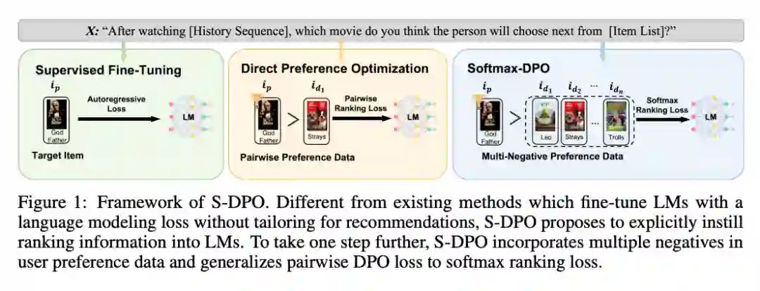 推荐系统旨在根据用户偏好数据预测个性化的物品排名列表。随着语言模型(LM)的兴起,基于语言模型的推荐系统因其广泛的世界知识和强大的推理能力而被广泛研究。大多数基于语言模型的推荐系统将历史交互转换为文本指令,并将一个正样本物品作为预测目标,用于微调语言模型。然而,这些方法未能充分利用偏好数据,也未针对个性化排名任务进行优化,这限制了基于语言模型的推荐系统的性能。本文提出了Softmax-DPO(S-DPO),以将排名信息注入语言模型,帮助基于语言模型的推荐系统区分偏好的物品与负样本项目,而不仅仅只关注正样本物品。具体而言,本文在用户偏好数据中引入多个负面样本,并设计了一种专门为基于语言模型的推荐系统设计的DPO损失的替代方式,该方式与softmax采样策略相联系。