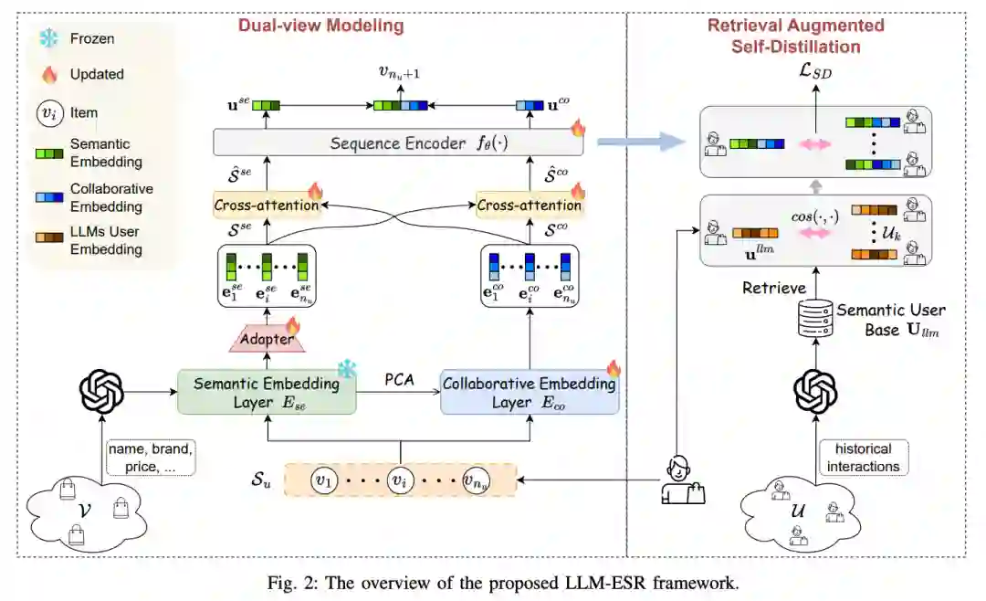 序列推荐系统(SRS)可以根据用户的过去交互物品序列预测其后续的偏好,然而传统SRS面临很多挑战,比如长尾用户和长尾物品困境,大多数用户只与有限数量的物品交互,而大多数物品则很少被交互。虽然一些研究工作缓解了这些问题,但仍然面临着交互信息稀缺而导致的摇摆或噪音等问题。本文利用大语言模型的强大语言能力,引入了顺序推荐的大型语言模型增强框架(LLM-ESR),该框架利用LLMs的语义嵌入来提升SRS性能,而无需增加计算开销。为了应对长尾物品的挑战,本文提出了一种双视图建模方法,将来自LLMs的语义信息与传统SRS的协同信号融合在一起。为了解决长尾用户的挑战,本文引入了一种检索增强自蒸馏技术,通过结合类似用户的更丰富的交互数据来细化用户偏好表示。