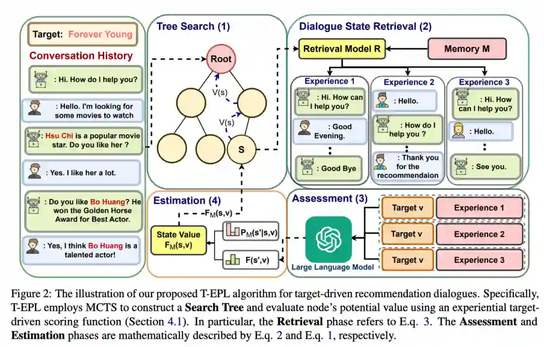 目标驱动的对话式推荐系统在对话管理过程中面临一定的挑战,因为成功的对话管理过程需要预测用户的交互对话行为。目前的方法存在许多局限性:(1)对话预测能力不足;(2)计算效率较低;(3)较少利用历史对话经验。为了解决这些问题,本问提出了一种称为经验政策学习(EPL)的新框架。具体而言,EPL体现了“从经验中学习”的原则,通过一个经验评分函数来促进预期,该函数利用存储在长期记忆中的相似历史对话来估计当前对话的状态。此外,为了展示其灵活性,本文引入了树结构EPL(T-EPL),并实现了基于大型语言模型(LLMs)和蒙特卡罗树搜索(MCTS)的无训练方法。T-EPL使用LLMs评估过去的对话状态,同时利用MCTS实现分层和多级推理。