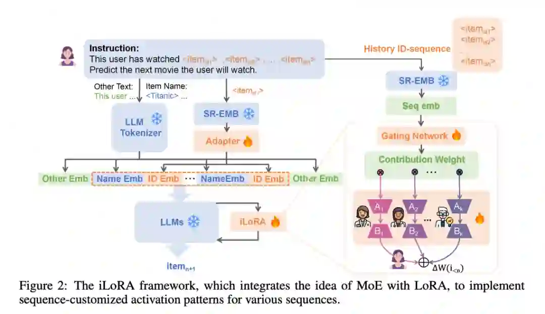 论文链接:https://arxiv.org/pdf/2408.10159 序列推荐系统通过分析过去的交互来预测用户下一个感兴趣的物品,从而使推荐与个人偏好相一致。当前有许多方法利用大型语言模型(LLMs)在知识理解和推理方面的优势,通过语言生成范式将LLMs应用于序列推荐任务。这些方法将用户行为序列转换为微调LLM的指令,并利用低秩适应(LoRA)模块来优化推荐。然而,在不同用户行为中统一应用一个LoRA,有时无法捕捉到个体间的差异,导致性能不佳以及不同序列之间的负迁移。为了解决这些挑战,本文提出了实例级LoRA(iLoRA),将LoRA与专家混合(MoE)框架相结合。iLoRA创建了一系列多样化的专家,每个专家捕捉用户偏好的特定方面,并引入了一个由序列表示指导的门控函数。该门控函数处理历史交互序列,以生成丰富的表示,指导门控网络输出定制的专家参与权重。这种量身定制的方法减轻了负迁移的影响,并动态调整以适应多样化的行为模式。