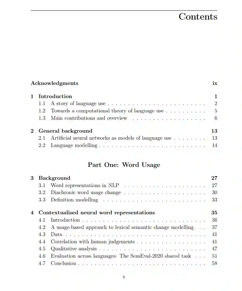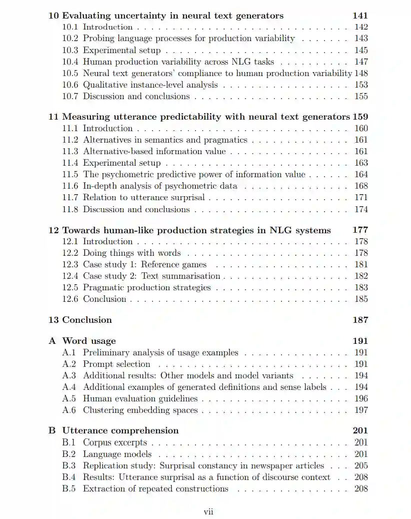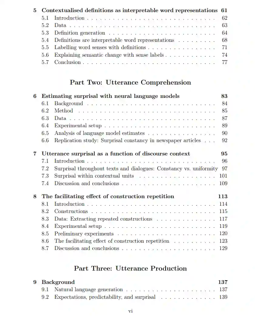 指导我的研究的终极动机——其中很大一部分,截至今天,已在这篇论文中描述——是逆向工程人类通过语言行为交换信息的能力。我相信,实现这一目标将与创建一个能像人类一样使用语言并作为语言使用的计算理论模型的创造相一致。这一研究领域的见解和朝这一理想模型的进步——一个可控但完全自主的、在情境中基础的语言代理——将为更忠实地再现人类语言行为的语言技术的发展提供信息和刺激。 走向这个目标的道路漫长,而博士生的生活太短暂,无法走完。但我可以满怀喜悦地说,现在我有了一张地图和大致的路线。回顾过去和展望未来,这对我来说是我博士学习最令人兴奋和宝贵的成果。不管怎样,成为并作为一名科学家是一种服务形式,而我所服务的社群,无论是广泛定义的还是更狭隘的界定,完全对我的内在斗争、紧张和学习成果漠不关心——这也是合理的。地图可能不完美,路线当然是暂时的,我所迈出的步伐有时摇摇晃晃,但它们是我对“社群”的贡献,我将在这篇论文中自豪地概述它们。我希望能回顾这些页面时,看到一个更精细的路线,更多的步数,以及相同的成就感。