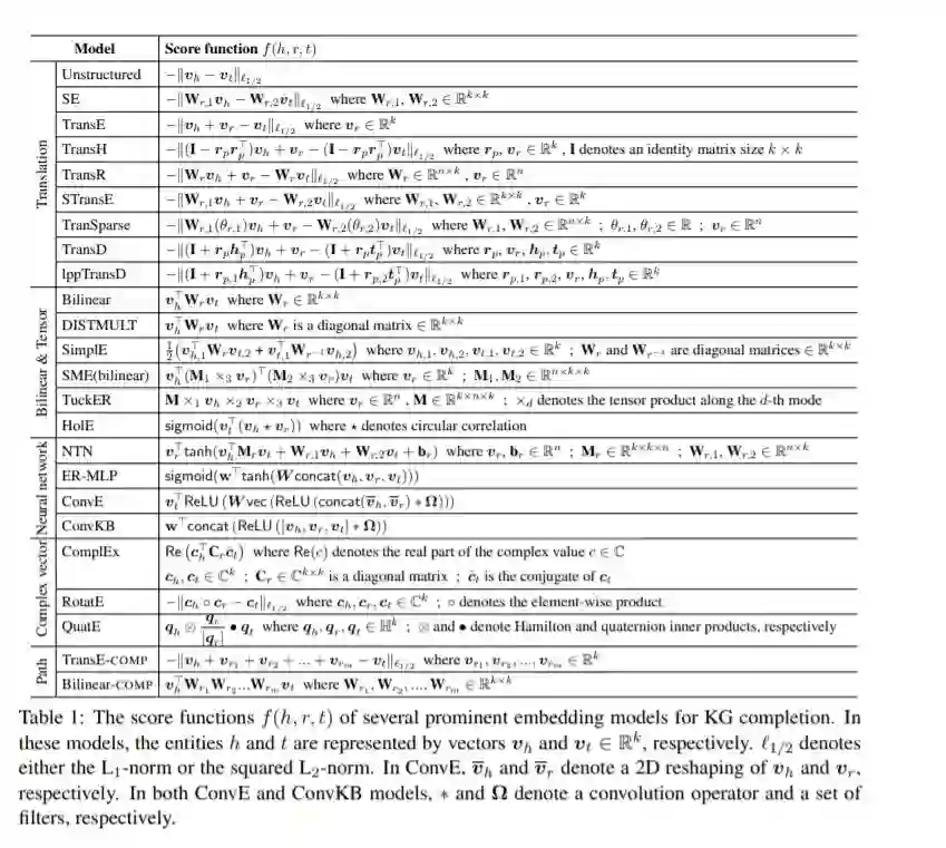 知识图谱是关于实体及其关系的集合,是非常有用资源。然而,由于知识图通常是不完备的,所以进行知识图补全或链接预测是有用的,即预测一个不在知识图谱中的关系是否可能是真的。本文综述了用于知识图谱完成的实体和关系嵌入模型,总结了在标准基准数据集上最新的实验结果,并指出了未来可能的研究方向。
