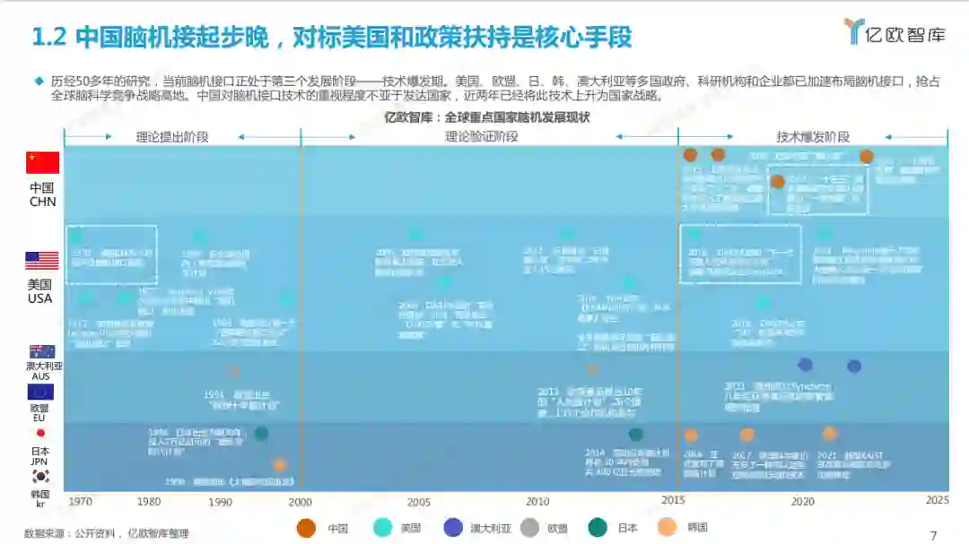 历经50多年的研究,当前脑机接口正处于第三个发展阶段——技术爆发期。美国、欧盟、日、韩、澳大利亚等多国政府、科研机构和企业都已加速布局脑机接口,抢占全球脑科学竞争战略高地。中国对脑机接口技术的重视程度不亚于发达国家,近两年已经将此技术上升为国家战略。 政策驱动:一体两翼脑计划达成共识,脑疾病治疗曙光出现