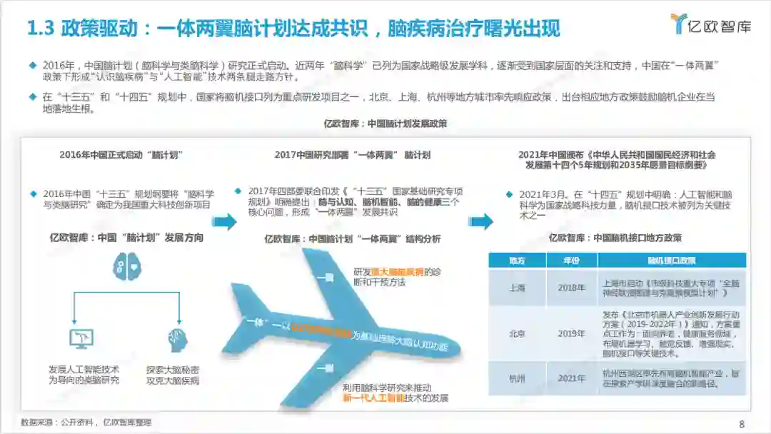 2016年,中国脑计划(脑科学与类脑科学)研究正式启动。近两年“脑科学”已列为国家战略级发展学科,逐渐受到国家层面的关注和支持,中国在“⼀体两翼”政策下形成“认识脑疾病”与“⼈⼯智能”技术两条腿⾛路⽅针。 在“十三五”和“十四五”规划中,国家将脑机接口列为重点研发项目之一,北京、上海、杭州等地方城市率先响应政策,出台相应地方政策鼓励脑机企业在当地落地生根。