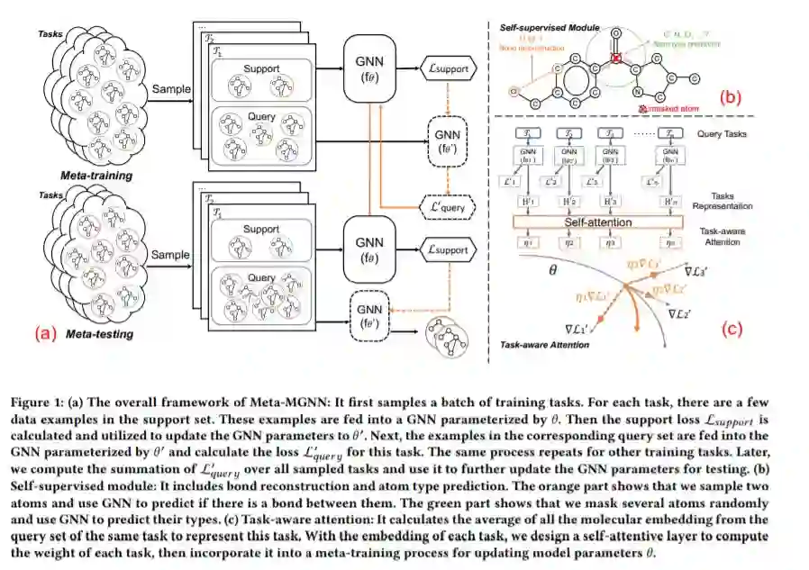 图神经网络最近的成功极大地促进了分子性质的预测,促进了药物发现等活动。现有的深度神经网络方法通常对每个属性都需要大量的训练数据集,在实验数据量有限的情况下(特别是新的分子属性)会影响其性能,这在实际情况中是常见的。为此,我们提出了Meta-MGNN,一种新颖的预测少样本分子性质的模型。Meta-MGNN应用分子图神经网络学习分子表示,建立元学习框架优化模型。为了挖掘未标记的分子信息,解决不同分子属性的任务异质性,Meta-MGNN进一步将分子结构、基于属性的自监督模块和自关注任务权重整合到Meta-MGNN框架中,强化了整个学习模型。在两个公共多属性数据集上进行的大量实验表明,Meta-MGNN优于各种最先进的方法。