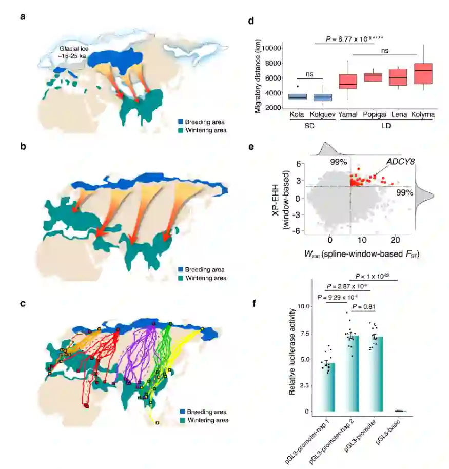 “迁徙生物如何发现其迁徙路线?”一直是社会和学术界广泛关注的议题,也是Science杂志125个最具挑战性科学问题之一。中国科学院动物所詹祥江等历时12年,利用卫星追踪数据和基因组信息,建立了一套北极游隼迁徙研究系统,发现游隼主要使用5条路线穿越亚欧大陆,西部游隼表现为短距离迁徙,东部为长距离迁徙。在末次冰盛期到全新世的转换过程中,冰川消退所导致的繁殖和越冬地变迁,可能是迁徙路线形成的主要历史原因。研究还发现迁徙距离更长的游隼携带ADCY8优势等位基因,该基因与长时记忆形成有关,表明长时记忆可能是鸟类长距离迁徙的重要基础。该研究结合遥感卫星追踪、基因组学、神经生物学等研究手段,通过多学科整合分析方法阐明了鸟类迁徙路线变迁成因和遗传基础。