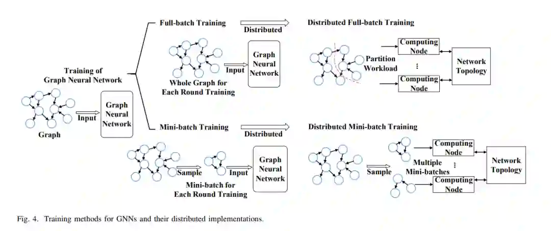 本节介绍分布式GNN训练的分类。如图5所示,我们首先根据第II-C节介绍的训练方法,即每轮是否涉及整个图,将其分为分布式全批训练和分布式小批训练,并显示两种类型的关键区别。通过分析这两种类型的工作流程,将它们分别划分为两个详细的类型。本节介绍了第一级类别,即分布式全批训练和分布式小批训练,并对它们进行了比较。这两种类型的第二级类别稍后将分别在第四节和第五节介绍。