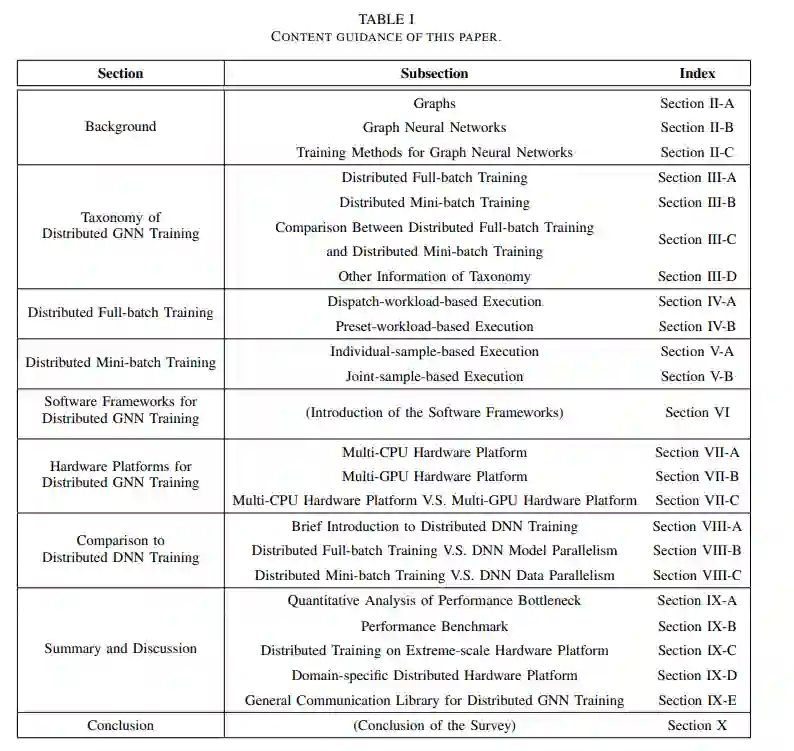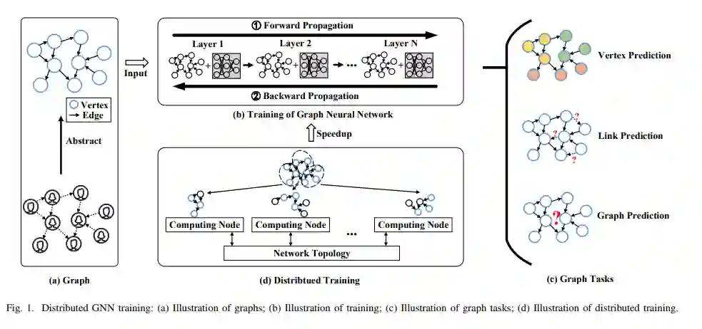 分布式训练是加速GNN训练[35]-[38],[40],[44]-[58]的流行解决方案。它试图通过向计算系统添加更多的计算资源或“节点”,并采用并行执行策略来加速整个计算过程,如图1 (d)所示。2019年提出的NeuGraph[44]是分布式GNN训练的第一篇发表作品。从那以后,近年来,人们不断尝试提高分布式GNN训练的效率,使用了各种各样的优化技术,包括工作负载分区[44]-[47],传输规划[37],[44]-[46],缓存策略[35],[51],[52]等。尽管做出了上述努力,但仍然缺乏对分布式GNN训练的综述。多个计算节点之间的管理和合作需要导致不同的工作流程,导致复杂的计算和通信模式,并使优化分布式GNN训练成为一个挑战。然而,尽管在这方面已经或正在做出大量的努力,但几乎没有任何关于这些挑战和解决方案的调研。目前的研究主要集中在GNN模型和硬件加速器[9]-[11],[59]-[62],但并不打算对GNN的分布式训练进行仔细的分类和总体概述,特别是从工作流、计算模式、通信模式和优化技术的角度。