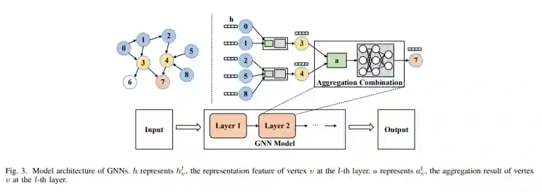 ****GNN是一种很有前途的从图数据中学习知识的算法模型[63]-[68]。它将图数据作为输入,并学习图中每个顶点的表示向量。学习到的表示可以用于下游任务,如顶点预测[15],链接预测[16]和图预测[17]。如图3所示,GNN模型由一个或多个层组成,包括邻居聚合和神经网络操作,分别称为aggregation步骤和Combination步骤。在Aggregation步骤中,使用Aggregate函数Aggregate()为每个目标顶点聚合来自上一GNN层的传入相邻顶点的特征向量。例如,在图3中,顶点4将使用Aggregate函数收集自身及其传入邻近顶点(即顶点2,5,8)的特征向量。在Combine步骤中,Combine函数Combine()使用神经网络操作转换每个顶点的聚合特征向量。C.图神经网络的训练方法在本小节中,我们介绍了GNN的训练方法,包括全批训练[69],[70]和小批训练[13],[71]-[74]两种方法。神经网络(GNN)的典型训练过程包括前向传播和后向传播。在正向传播中,输入数据通过神经网络层传递到输出。神经网络通过将前向传播的输出与预先定义的标签进行比较,产生输出的差异。然后在反向传播中,将这些差异沿相反方向在神经网络层中传播,生成梯度来更新模型参数。如图4所示,根据每轮是否涉及整个图,GNN的训练方法可分为全批训练[69]、[70]和小批训练[13]、[71]-[74]。这里,我们定义了一轮全批训练,包括模型计算阶段(包括前向和后向传播)和参数更新阶段。另一方面,小批处理训练中的一轮额外包含一个采样阶段,该阶段对后续模型计算所需的小型工作负载进行采样,因此定位在其他两个阶段之前。因此,一个epoch被定义为数据的整个传递过程,相当于一轮全批训练,而小批训练通常包含几轮。下面将详细介绍这两种方法。