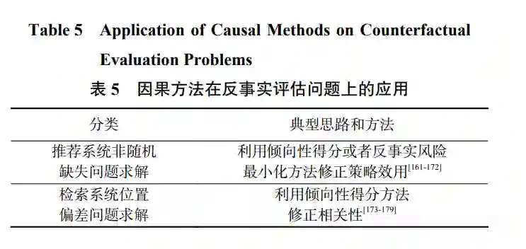 反事实评估(counterfactual evaluation)指的是机 器学习模型的优化目标本身是反事实的,这通常出 现在使用有偏差的标注数据训练得到无偏模型的情 景,例如基于点击数据的检索和推荐系统学习任 务.由于任务本身需要反事实术语进行表述,因果理 论对这类问题的建模和研究起到了关键性的作用, 如表 5 所示: