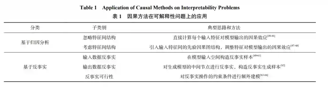 机器学习模型会根据给定输入计算得到对应的 输出,但一般不会给出关于“为什么会得到此输出” 的解释.然而这种解释有助于人们理解模型的运作机 制,合理的解释能够使结果更具有说服力.因此近年 来涌现出许多致力于为现有模型提供解释方法的工 作,为模型的诊断分析提供了有效手段[39] .解释的核 心在于“模型得到此输出,是因为输入具有什么样的 特征”,这本质上是在探讨在此模型参与过程中输入 特征与输出结果之间的因果关系,例如估计特征对 输出变量的因果效应强度. 由于机器学习模型对输入数据的处理过程是一 个独立而完整的过程,输入与输出变量之间一般不 会受到混杂因素的影响,因此即使不使用因果术语 也可以对任务进行描述.这体现为早期的模型解释方 法并不强调因果,少数强调因果的方法也并不一定依赖因果术语.因果理论的引入为可解释性问题领域 带来的贡献主要有 2 个方面:一是在基于归因分析 的解释方法中建模特征内部的因果关系;二是引入 一类新的解释方法即基于反事实的解释.基于归因分 析和基于反事实的解释构成了当前最主要的 2 大类 模型解释方法如表 1 所示,以下分别展开介绍.