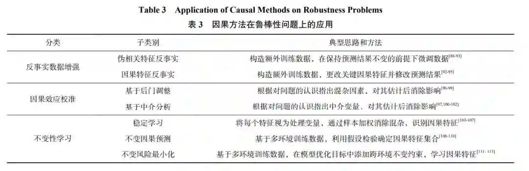 迁移学习允许模型获得目标环境的少量数据以 进行适应学习,然而在一些高风险场景中,可能需要 机器学习模型在完全陌生的环境中也能正常工作, 如医疗、法律、金融及交通等.以自动驾驶为例,即使 有大量的真实道路行驶数据,自动驾驶智能体仍会 面临各种突发情况,这些情况可能无法被预见但仍 需要被正确处理.这类任务无法提供目标环境下的训 练数据 ,此时模型的表现称为分布外泛化(out-ofdistribution generalization).如果模型具有良好的分布 外泛化能力,则称其具有鲁棒性(robustness). X Y P ′ (X, Y) P(X, Y) Y X P ′ (X|Y) = P(X|Y) 这类问题在未引入因果术语的情况下就已经展 开了广泛的研究.如分布鲁棒性研究[79-81] 考虑当数据 分布改变在一定幅度之内时如何学习得到鲁棒的模 型,常见思路是对训练样本做加权处理;对抗鲁棒性 研究[8,82-83] 考虑当样本受到小幅度扰动时模型不应当 改变输出结果,常见思路是将对抗攻击样本加入训 练.这类研究常常忽略变量间的因果结构,面临的主 要问题是很难决定数据分布或者样本的扰动幅度大 小和度量准则,这就使得研究中所做的假设很难符 合真实场景,极大地限制了在实际中的应用.因果理 论的引入为建模变量间的结构提供了可能,同时其 蕴含的“机制不变性”原理为鲁棒性问题提供了更合 理的假设,因为真实数据往往是从遵循物理规律不 变的现实世界中采集获得.例如针对输入为 、输出 为 的预测问题,不考虑结构的分布鲁棒性方法会假 设未知环境 应当与真实环境 的差异较 小,如限制联合分布的 KL 散度小于一定阈值;而考 虑结构的因果方法则通常会假设机制不变,例如当 是 的因时假设 ,在因果关系成立的 情况下后者通常是更合理的. 一些从伪相关特征入手研究鲁棒性问题的工作 虽然未使用因果术语,实际上已经引入了因果结构 的假设.这些工作针对的往往是已知的伪相关特征, 如图像分类任务中的背景、文本同义句判断 SNLI 数 据集中的单条文本[84]、重复问题检测 QuaraQP 数据 集中的样本频率[85] 等.在实际场景中针对这些伪相关 特征进行偏差去除(debias),以避免其分布发生变化 时影响模型表现.这类工作隐含的假设是伪相关特征 与目标预测变量没有因果关系.一种直接的解决方法 是调整训练数据的权重,使得伪相关特征不再与预 测变量相关[85] .还有一类方法会单独训练一个仅使用 伪相关特征预测的模型,然后将其与主模型融合在 一起再次训练,完成后仅保留主模型[86-87] .然而由于实 际应用中通常很难预先确定伪相关特征,这类工作 在解决鲁棒性问题上具有明显的局限性. 因果理论的引入对于解决鲁棒性问题提供了新 的思路,主要的优势在于对变量结构的建模和更合 理的假设.这类方法包括反事实数据增强(counterfactual data augmentation)、因果效应校准和不变性学 习.如表 3 所示 ,反事实数据增强考虑从数据入手消 除伪相关关系,因果效应校准通过调整偏差特征的 作用来减轻偏差,不变性学习通过改变建模方式学 习不变的因果机制,以下分别展开介绍.